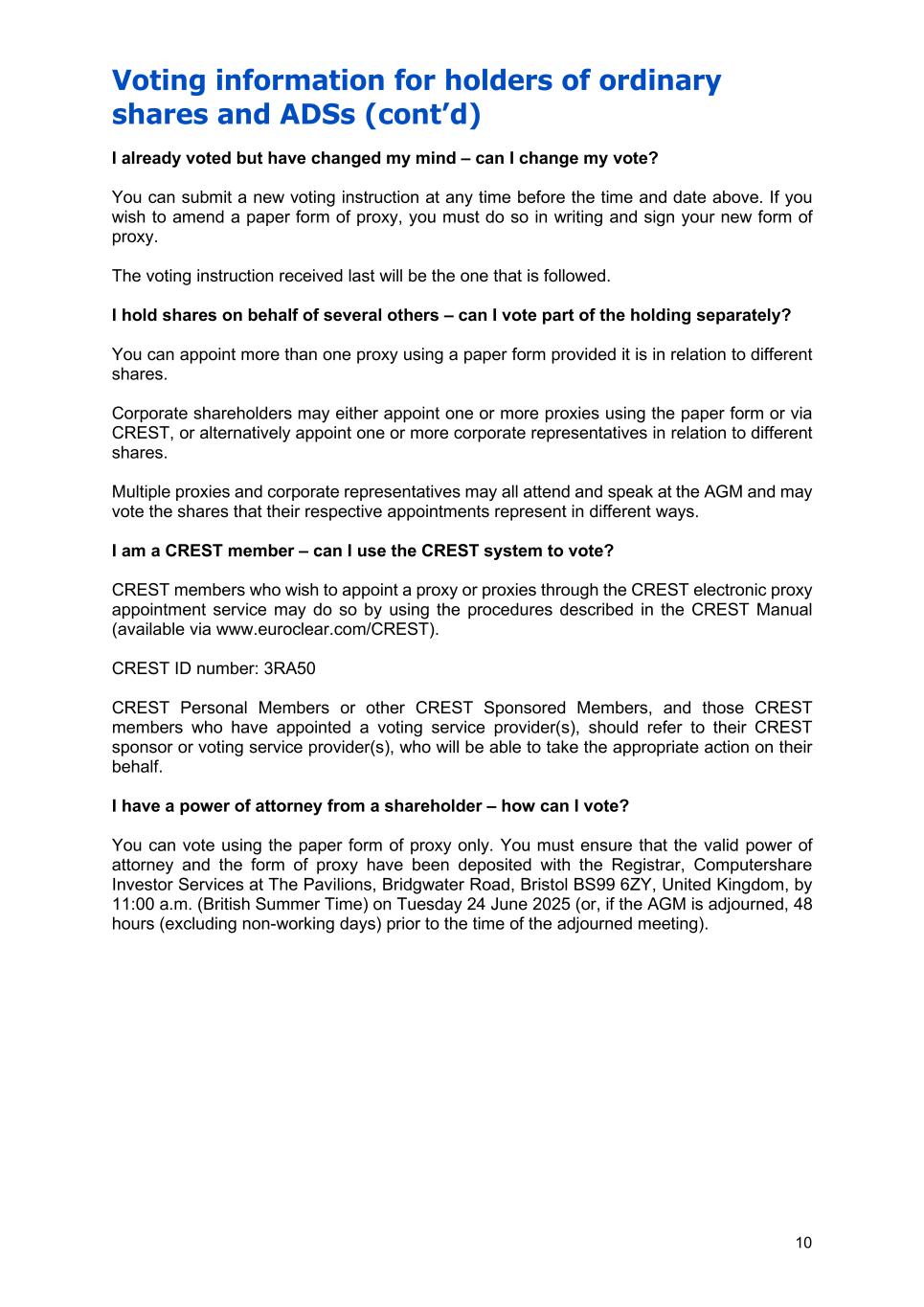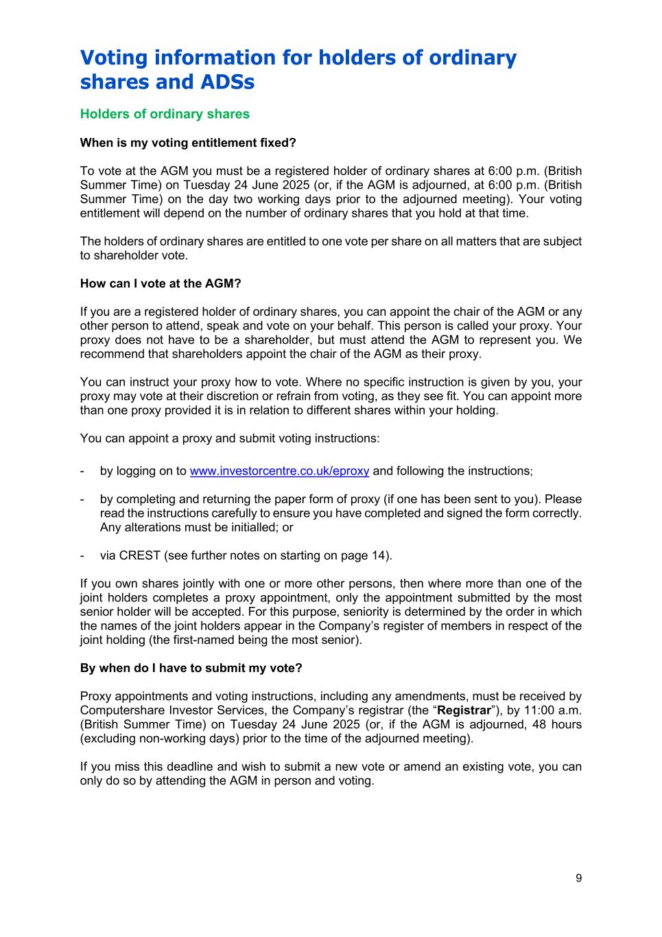 Voting information for holders of ordinary shares and ADSs 9 Holders of ordinary shares When is my voting entitlement fixed? To vote at the AGM you must be a registered holder of ordinary shares at 6:00 p.m. (British Summer Time) on Tuesday 24 June 2025 (or, if the AGM is adjourned, at 6:00 p.m. (British Summer Time) on the day two working days prior to the adjourned meeting). Your voting entitlement will depend on the number of ordinary shares that you hold at that time. The holders of ordinary shares are entitled to one vote per share on all matters that are subject to shareholder vote. How can I vote at the AGM? If you are a registered holder of ordinary shares, you can appoint the chair of the AGM or any other person to attend, speak and vote on your behalf. This person is called your proxy. Your proxy does not have to be a shareholder, but must attend the AGM to represent you. We recommend that shareholders appoint the chair of the AGM as their proxy. You can instruct your proxy how to vote. Where no specific instruction is given by you, your proxy may vote at their discretion or refrain from voting, as they see fit. You can appoint more than one proxy provided it is in relation to different shares within your holding. You can appoint a proxy and submit voting instructions: - by logging on to www.investorcentre.co.uk/eproxy and following the instructions; - by completing and returning the paper form of proxy (if one has been sent to you). Please read the instructions carefully to ensure you have completed and signed the form correctly. Any alterations must be initialled; or - via CREST (see further notes on starting on page 14). If you own shares jointly with one or more other persons, then where more than one of the joint holders completes a proxy appointment, only the appointment submitted by the most senior holder will be accepted. For this purpose, seniority is determined by the order in which the names of the joint holders appear in the Company’s register of members in respect of the joint holding (the first-named being the most senior). By when do I have to submit my vote? Proxy appointments and voting instructions, including any amendments, must be received by Computershare Investor Services, the Company’s registrar (the “Registrar”), by 11:00 a.m. (British Summer Time) on Tuesday 24 June 2025 (or, if the AGM is adjourned, 48 hours (excluding non-working days) prior to the time of the adjourned meeting). If you miss this deadline and wish to submit a new vote or amend an existing vote, you can only do so by attending the AGM in person and voting.