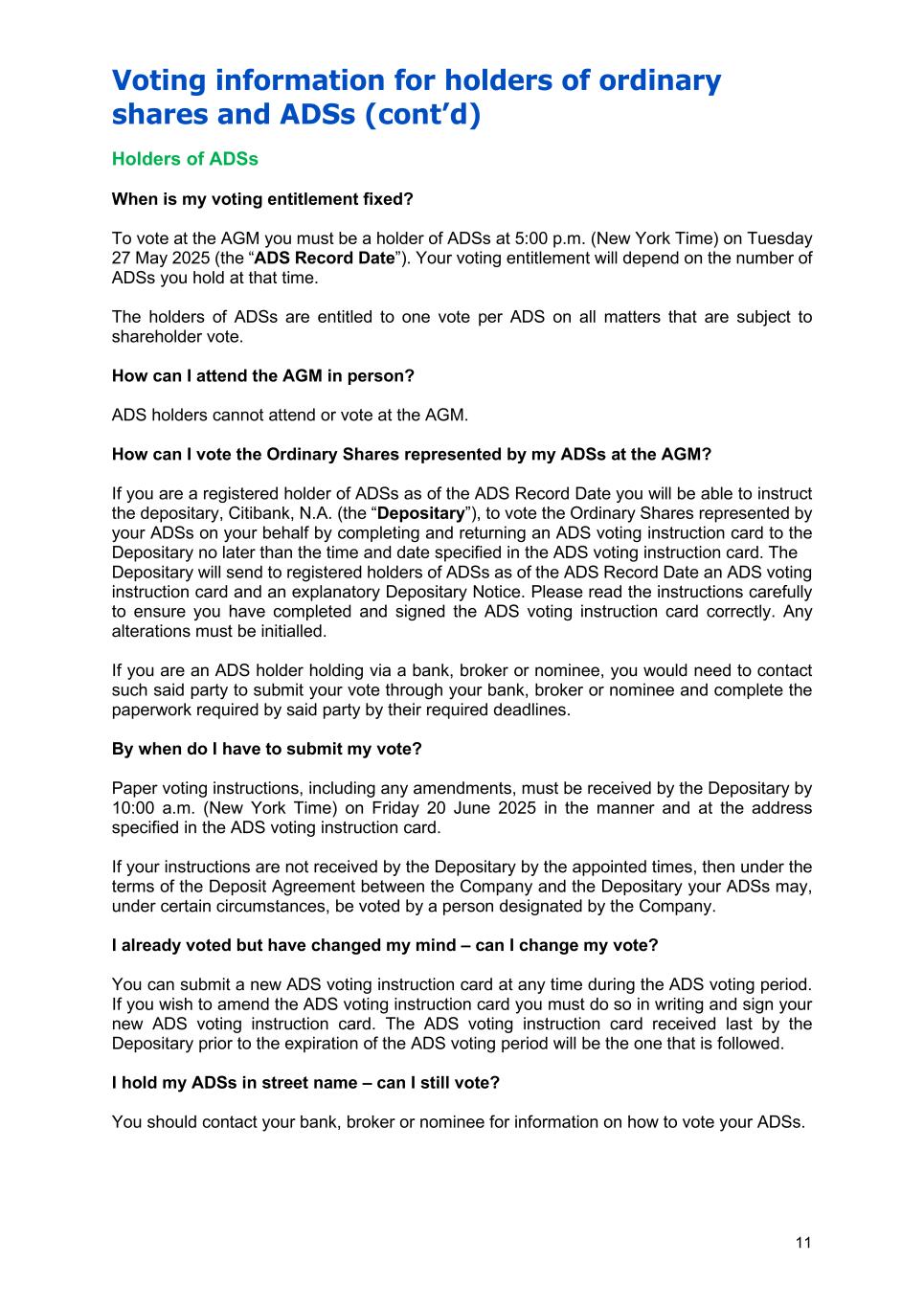 Voting information for holders of ordinary shares and ADSs (cont’d) 10 I already voted but have changed my mind – can I change my vote? You can submit a new voting instruction at any time before the time and date above. If you wish to amend a paper form of proxy, you must do so in writing and sign your new form of proxy. The voting instruction received last will be the one that is followed. I hold shares on behalf of several others – can I vote part of the holding separately? You can appoint more than one proxy using a paper form provided it is in relation to different shares. Corporate shareholders may either appoint one or more proxies using the paper form or via CREST, or alternatively appoint one or more corporate representatives in relation to different shares. Multiple proxies and corporate representatives may all attend and speak at the AGM and may vote the shares that their respective appointments represent in different ways. I am a CREST member – can I use the CREST system to vote? CREST members who wish to appoint a proxy or proxies through the CREST electronic proxy appointment service may do so by using the procedures described in the CREST Manual (available via www.euroclear.com/CREST). CREST ID number: 3RA50 CREST Personal Members or other CREST Sponsored Members, and those CREST members who have appointed a voting service provider(s), should refer to their CREST sponsor or voting service provider(s), who will be able to take the appropriate action on their behalf. I have a power of attorney from a shareholder – how can I vote? You can vote using the paper form of proxy only. You must ensure that the valid power of attorney and the form of proxy have been deposited with the Registrar, Computershare Investor Services at The Pavilions, Bridgwater Road, Bristol BS99 6ZY, United Kingdom, by 11:00 a.m. (British Summer Time) on Tuesday 24 June 2025 (or, if the AGM is adjourned, 48 hours (excluding non-working days) prior to the time of the adjourned meeting).
