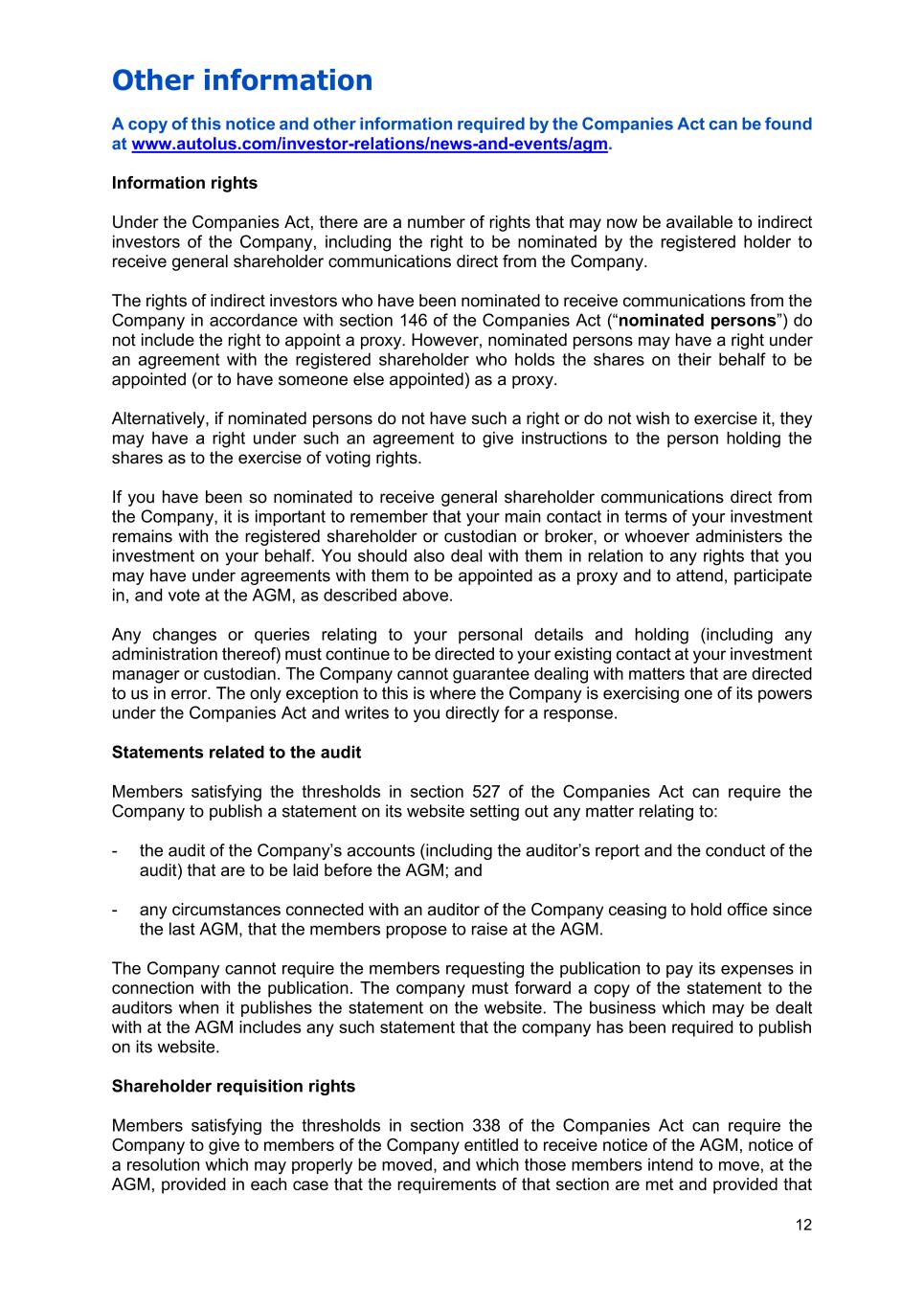 Other information 12 A copy of this notice and other information required by the Companies Act can be found at www.autolus.com/investor-relations/news-and-events/agm. Information rights Under the Companies Act, there are a number of rights that may now be available to indirect investors of the Company, including the right to be nominated by the registered holder to receive general shareholder communications direct from the Company. The rights of indirect investors who have been nominated to receive communications from the Company in accordance with section 146 of the Companies Act (“nominated persons”) do not include the right to appoint a proxy. However, nominated persons may have a right under an agreement with the registered shareholder who holds the shares on their behalf to be appointed (or to have someone else appointed) as a proxy. Alternatively, if nominated persons do not have such a right or do not wish to exercise it, they may have a right under such an agreement to give instructions to the person holding the shares as to the exercise of voting rights. If you have been so nominated to receive general shareholder communications direct from the Company, it is important to remember that your main contact in terms of your investment remains with the registered shareholder or custodian or broker, or whoever administers the investment on your behalf. You should also deal with them in relation to any rights that you may have under agreements with them to be appointed as a proxy and to attend, participate in, and vote at the AGM, as described above. Any changes or queries relating to your personal details and holding (including any administration thereof) must continue to be directed to your existing contact at your investment manager or custodian. The Company cannot guarantee dealing with matters that are directed to us in error. The only exception to this is where the Company is exercising one of its powers under the Companies Act and writes to you directly for a response. Statements related to the audit Members satisfying the thresholds in section 527 of the Companies Act can require the Company to publish a statement on its website setting out any matter relating to: - the audit of the Company’s accounts (including the auditor’s report and the conduct of the audit) that are to be laid before the AGM; and - any circumstances connected with an auditor of the Company ceasing to hold office since the last AGM, that the members propose to raise at the AGM. The Company cannot require the members requesting the publication to pay its expenses in connection with the publication. The company must forward a copy of the statement to the auditors when it publishes the statement on the website. The business which may be dealt with at the AGM includes any such statement that the company has been required to publish on its website. Shareholder requisition rights Members satisfying the thresholds in section 338 of the Companies Act can require the Company to give to members of the Company entitled to receive notice of the AGM, notice of a resolution which may properly be moved, and which those members intend to move, at the AGM, provided in each case that the requirements of that section are met and provided that