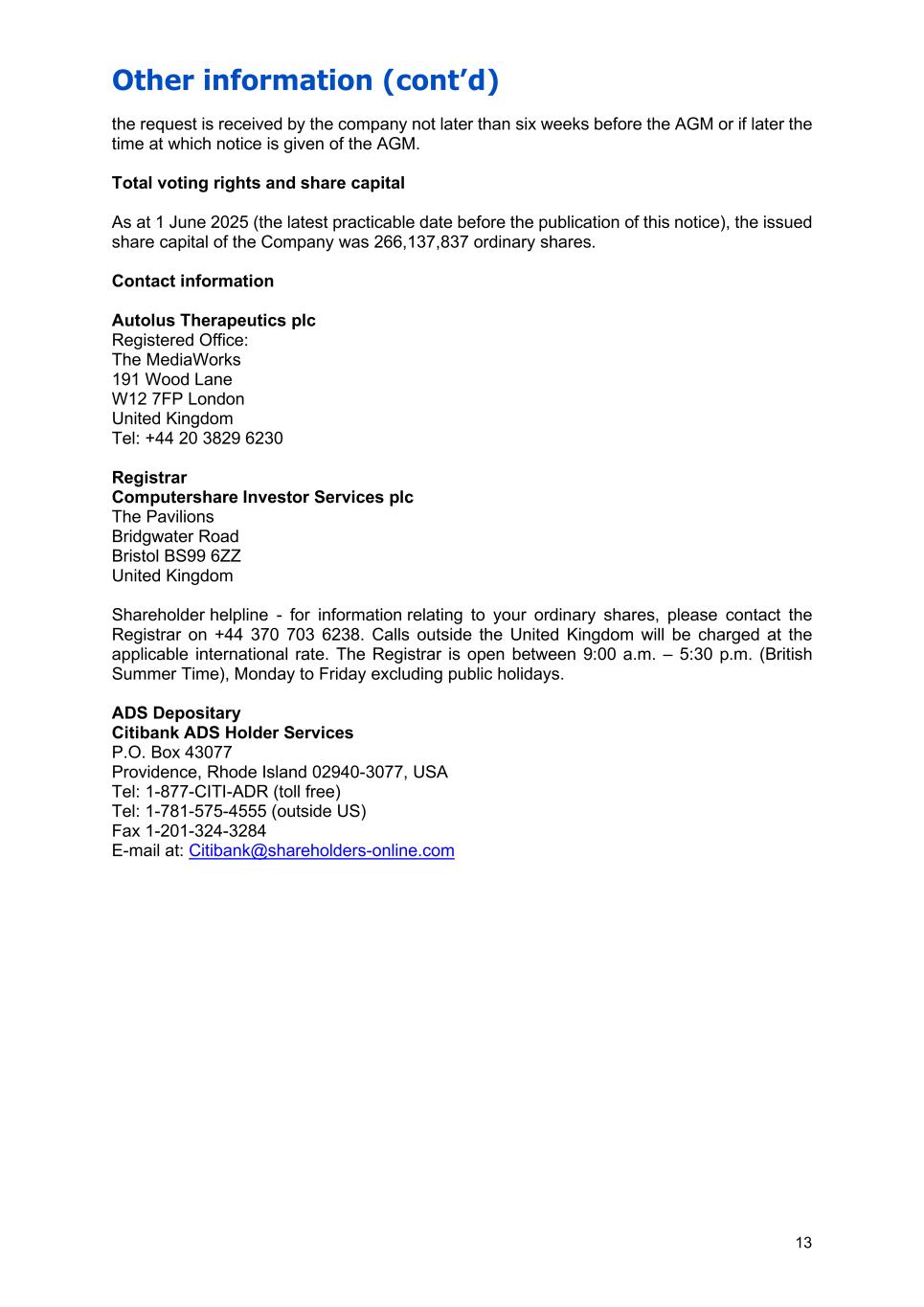Other information (cont’d) 13 the request is received by the company not later than six weeks before the AGM or if later the time at which notice is given of the AGM. Total voting rights and share capital As at 1 June 2025 (the latest practicable date before the publication of this notice), the issued share capital of the Company was 266,137,837 ordinary shares. Contact information Autolus Therapeutics plc Registered Office: The MediaWorks 191 Wood Lane W12 7FP London United Kingdom Tel: +44 20 3829 6230 Registrar Computershare Investor Services plc The Pavilions Bridgwater Road Bristol BS99 6ZZ United Kingdom Shareholder helpline - for information relating to your ordinary shares, please contact the Registrar on +44 370 703 6238. Calls outside the United Kingdom will be charged at the applicable international rate. The Registrar is open between 9:00 a.m. – 5:30 p.m. (British Summer Time), Monday to Friday excluding public holidays. ADS Depositary Citibank ADS Holder Services P.O. Box 43077 Providence, Rhode Island 02940-3077, USA Tel: 1-877-CITI-ADR (toll free) Tel: 1-781-575-4555 (outside US) Fax 1-201-324-3284 E-mail at: Citibank@shareholders-online.com
