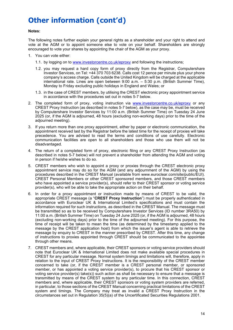 Other information (cont’d) 14 Notes: The following notes further explain your general rights as a shareholder and your right to attend and vote at the AGM or to appoint someone else to vote on your behalf. Shareholders are strongly encouraged to vote your shares by appointing the chair of the AGM as your proxy. 1. You can vote either: 1.1. by logging on to www.investorcentre.co.uk/eproxy and following the instructions; 1.2. you may request a hard copy form of proxy directly from the Registrar, Computershare Investor Services, on Tel: +44 370 703 6238. Calls cost 12 pence per minute plus your phone company’s access charge. Calls outside the United Kingdom will be charged at the applicable international rate. Lines are open between 9:00 a.m. – 5:30 p.m. (British Summer Time), Monday to Friday excluding public holidays in England and Wales; or 1.3. in the case of CREST members, by utilising the CREST electronic proxy appointment service in accordance with the procedures set out in notes 5-7 below. 2. The completed form of proxy, voting instruction via www.investorcentre.co.uk/eproxy or any CREST Proxy Instruction (as described in notes 5-7 below), as the case may be, must be received by Computershare Investor Services by 11:00 a.m. (British Summer Time) on Tuesday 24 June 2025 (or, if the AGM is adjourned, 48 hours (excluding non-working days) prior to the time of the adjourned meeting). 3. If you return more than one proxy appointment, either by paper or electronic communication, the appointment received last by the Registrar before the latest time for the receipt of proxies will take precedence. You are advised to read the terms and conditions of use carefully. Electronic communication facilities are open to all shareholders and those who use them will not be disadvantaged. 4. The return of a completed form of proxy, electronic filing or any CREST Proxy Instruction (as described in notes 5-7 below) will not prevent a shareholder from attending the AGM and voting in person if he/she wishes to do so. 5. CREST members who wish to appoint a proxy or proxies through the CREST electronic proxy appointment service may do so for the AGM (and any adjournment of the AGM) by using the procedures described in the CREST Manual (available from www.euroclear.com/site/public/EUI). CREST Personal Members or other CREST sponsored members, and those CREST members who have appointed a service provider(s), should refer to their CREST sponsor or voting service provider(s), who will be able to take the appropriate action on their behalf. 6. In order for a proxy appointment or instruction made by means of CREST to be valid, the appropriate CREST message (a “CREST Proxy Instruction”) must be properly authenticated in accordance with Euroclear UK & International Limited’s specifications and must contain the information required for such instructions, as described in the CREST Manual. The message must be transmitted so as to be received by Computershare Investor Services (ID number 3RA50) by 11:00 a.m. (British Summer Time) on Tuesday 24 June 2025 (or, if the AGM is adjourned, 48 hours (excluding non-working days) prior to the time of the adjourned meeting). For this purpose, the time of receipt will be taken to mean the time (as determined by the timestamp applied to the message by the CREST application host) from which the issuer’s agent is able to retrieve the message by enquiry to CREST in the manner prescribed by CREST. After this time, any change of instructions to proxies appointed through CREST should be communicated to the appointee through other means. 7. CREST members and, where applicable, their CREST sponsors or voting service providers should note that Euroclear UK & International Limited does not make available special procedures in CREST for any particular message. Normal system timings and limitations will, therefore, apply in relation to the input of CREST Proxy Instructions. It is the responsibility of the CREST member concerned to take (or, if the CREST member is a CREST personal member, or sponsored member, or has appointed a voting service provider(s), to procure that his CREST sponsor or voting service provider(s) take(s)) such action as shall be necessary to ensure that a message is transmitted by means of the CREST system by any particular time. In this connection, CREST members and, where applicable, their CREST sponsors or voting system providers are referred, in particular, to those sections of the CREST Manual concerning practical limitations of the CREST system and timings. The Company may treat as invalid a CREST Proxy Instruction in the circumstances set out in Regulation 35(5)(a) of the Uncertificated Securities Regulations 2001.