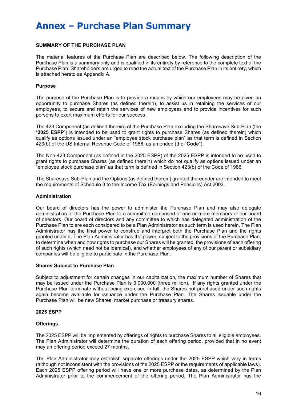 Annex – Purchase Plan Summary 16 SUMMARY OF THE PURCHASE PLAN The material features of the Purchase Plan are described below. The following description of the Purchase Plan is a summary only and is qualified in its entirety by reference to the complete text of the Purchase Plan. Shareholders are urged to read the actual text of the Purchase Plan in its entirety, which is attached hereto as Appendix A. Purpose The purpose of the Purchase Plan is to provide a means by which our employees may be given an opportunity to purchase Shares (as defined therein), to assist us in retaining the services of our employees, to secure and retain the services of new employees and to provide incentives for such persons to exert maximum efforts for our success. The 423 Component (as defined therein) of the Purchase Plan excluding the Sharesave Sub-Plan (the “2025 ESPP”) is intended to be used to grant rights to purchase Shares (as defined therein) which qualify as options issued under an “employee stock purchase plan” as that term is defined in Section 423(b) of the US Internal Revenue Code of 1986, as amended (the “Code”). The Non-423 Component (as defined in the 2025 ESPP) of the 2025 ESPP is intended to be used to grant rights to purchase Shares (as defined therein) which do not qualify as options issued under an “employee stock purchase plan” as that term is defined in Section 423(b) of the Code of 1986. The Sharesave Sub-Plan and the Options (as defined therein) granted thereunder are intended to meet the requirements of Schedule 3 to the Income Tax (Earnings and Pensions) Act 2003. Administration Our board of directors has the power to administer the Purchase Plan and may also delegate administration of the Purchase Plan to a committee comprised of one or more members of our board of directors. Our board of directors and any committee to which has delegated administration of the Purchase Plan to are each considered to be a Plan Administrator as such term is used herein. The Plan Administrator has the final power to construe and interpret both the Purchase Plan and the rights granted under it. The Plan Administrator has the power, subject to the provisions of the Purchase Plan, to determine when and how rights to purchase our Shares will be granted, the provisions of each offering of such rights (which need not be identical), and whether employees of any of our parent or subsidiary companies will be eligible to participate in the Purchase Plan. Shares Subject to Purchase Plan Subject to adjustment for certain changes in our capitalization, the maximum number of Shares that may be issued under the Purchase Plan is 3,000,000 (three million). If any rights granted under the Purchase Plan terminate without being exercised in full, the Shares not purchased under such rights again become available for issuance under the Purchase Plan. The Shares issuable under the Purchase Plan will be new Shares, market purchase or treasury shares. 2025 ESPP Offerings The 2025 ESPP will be implemented by offerings of rights to purchase Shares to all eligible employees. The Plan Administrator will determine the duration of each offering period, provided that in no event may an offering period exceed 27 months. The Plan Administrator may establish separate offerings under the 2025 ESPP which vary in terms (although not inconsistent with the provisions of the 2025 ESPP or the requirements of applicable laws). Each 2025 ESPP offering period will have one or more purchase dates, as determined by the Plan Administrator prior to the commencement of the offering period. The Plan Administrator has the