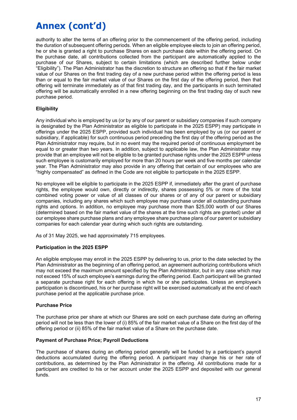 Annex (cont’d) 17 authority to alter the terms of an offering prior to the commencement of the offering period, including the duration of subsequent offering periods. When an eligible employee elects to join an offering period, he or she is granted a right to purchase Shares on each purchase date within the offering period. On the purchase date, all contributions collected from the participant are automatically applied to the purchase of our Shares, subject to certain limitations (which are described further below under “Eligibility”). The Plan Administrator has the discretion to structure an offering so that if the fair market value of our Shares on the first trading day of a new purchase period within the offering period is less than or equal to the fair market value of our Shares on the first day of the offering period, then that offering will terminate immediately as of that first trading day, and the participants in such terminated offering will be automatically enrolled in a new offering beginning on the first trading day of such new purchase period. Eligibility Any individual who is employed by us (or by any of our parent or subsidiary companies if such company is designated by the Plan Administrator as eligible to participate in the 2025 ESPP) may participate in offerings under the 2025 ESPP, provided such individual has been employed by us (or our parent or subsidiary, if applicable) for such continuous period preceding the first day of the offering period as the Plan Administrator may require, but in no event may the required period of continuous employment be equal to or greater than two years. In addition, subject to applicable law, the Plan Administrator may provide that an employee will not be eligible to be granted purchase rights under the 2025 ESPP unless such employee is customarily employed for more than 20 hours per week and five months per calendar year. The Plan Administrator may also provide in any offering that certain of our employees who are “highly compensated” as defined in the Code are not eligible to participate in the 2025 ESPP. No employee will be eligible to participate in the 2025 ESPP if, immediately after the grant of purchase rights, the employee would own, directly or indirectly, shares possessing 5% or more of the total combined voting power or value of all classes of our shares or of any of our parent or subsidiary companies, including any shares which such employee may purchase under all outstanding purchase rights and options. In addition, no employee may purchase more than $25,000 worth of our Shares (determined based on the fair market value of the shares at the time such rights are granted) under all our employee share purchase plans and any employee share purchase plans of our parent or subsidiary companies for each calendar year during which such rights are outstanding. As of 31 May 2025, we had approximately 715 employees. Participation in the 2025 ESPP An eligible employee may enroll in the 2025 ESPP by delivering to us, prior to the date selected by the Plan Administrator as the beginning of an offering period, an agreement authorizing contributions which may not exceed the maximum amount specified by the Plan Administrator, but in any case which may not exceed 15% of such employee’s earnings during the offering period. Each participant will be granted a separate purchase right for each offering in which he or she participates. Unless an employee’s participation is discontinued, his or her purchase right will be exercised automatically at the end of each purchase period at the applicable purchase price. Purchase Price The purchase price per share at which our Shares are sold on each purchase date during an offering period will not be less than the lower of (i) 85% of the fair market value of a Share on the first day of the offering period or (ii) 85% of the fair market value of a Share on the purchase date. Payment of Purchase Price; Payroll Deductions The purchase of shares during an offering period generally will be funded by a participant’s payroll deductions accumulated during the offering period. A participant may change his or her rate of contributions, as determined by the Plan Administrator in the offering. All contributions made for a participant are credited to his or her account under the 2025 ESPP and deposited with our general funds.