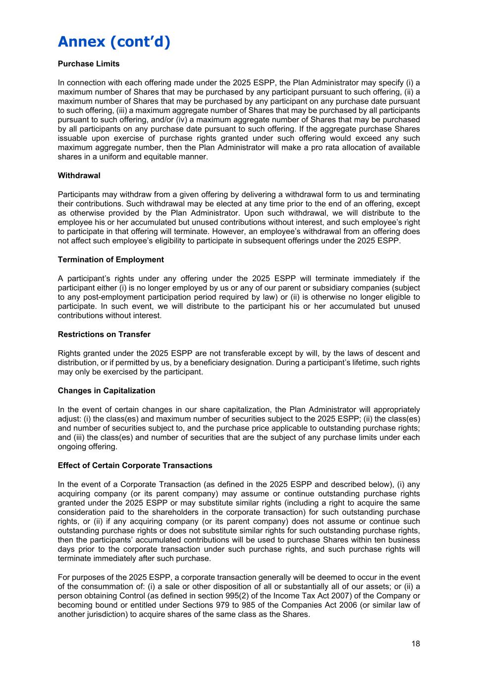Annex (cont’d) 18 Purchase Limits In connection with each offering made under the 2025 ESPP, the Plan Administrator may specify (i) a maximum number of Shares that may be purchased by any participant pursuant to such offering, (ii) a maximum number of Shares that may be purchased by any participant on any purchase date pursuant to such offering, (iii) a maximum aggregate number of Shares that may be purchased by all participants pursuant to such offering, and/or (iv) a maximum aggregate number of Shares that may be purchased by all participants on any purchase date pursuant to such offering. If the aggregate purchase Shares issuable upon exercise of purchase rights granted under such offering would exceed any such maximum aggregate number, then the Plan Administrator will make a pro rata allocation of available shares in a uniform and equitable manner. Withdrawal Participants may withdraw from a given offering by delivering a withdrawal form to us and terminating their contributions. Such withdrawal may be elected at any time prior to the end of an offering, except as otherwise provided by the Plan Administrator. Upon such withdrawal, we will distribute to the employee his or her accumulated but unused contributions without interest, and such employee’s right to participate in that offering will terminate. However, an employee’s withdrawal from an offering does not affect such employee’s eligibility to participate in subsequent offerings under the 2025 ESPP. Termination of Employment A participant’s rights under any offering under the 2025 ESPP will terminate immediately if the participant either (i) is no longer employed by us or any of our parent or subsidiary companies (subject to any post-employment participation period required by law) or (ii) is otherwise no longer eligible to participate. In such event, we will distribute to the participant his or her accumulated but unused contributions without interest. Restrictions on Transfer Rights granted under the 2025 ESPP are not transferable except by will, by the laws of descent and distribution, or if permitted by us, by a beneficiary designation. During a participant’s lifetime, such rights may only be exercised by the participant. Changes in Capitalization In the event of certain changes in our share capitalization, the Plan Administrator will appropriately adjust: (i) the class(es) and maximum number of securities subject to the 2025 ESPP; (ii) the class(es) and number of securities subject to, and the purchase price applicable to outstanding purchase rights; and (iii) the class(es) and number of securities that are the subject of any purchase limits under each ongoing offering. Effect of Certain Corporate Transactions In the event of a Corporate Transaction (as defined in the 2025 ESPP and described below), (i) any acquiring company (or its parent company) may assume or continue outstanding purchase rights granted under the 2025 ESPP or may substitute similar rights (including a right to acquire the same consideration paid to the shareholders in the corporate transaction) for such outstanding purchase rights, or (ii) if any acquiring company (or its parent company) does not assume or continue such outstanding purchase rights or does not substitute similar rights for such outstanding purchase rights, then the participants’ accumulated contributions will be used to purchase Shares within ten business days prior to the corporate transaction under such purchase rights, and such purchase rights will terminate immediately after such purchase. For purposes of the 2025 ESPP, a corporate transaction generally will be deemed to occur in the event of the consummation of: (i) a sale or other disposition of all or substantially all of our assets; or (ii) a person obtaining Control (as defined in section 995(2) of the Income Tax Act 2007) of the Company or becoming bound or entitled under Sections 979 to 985 of the Companies Act 2006 (or similar law of another jurisdiction) to acquire shares of the same class as the Shares.