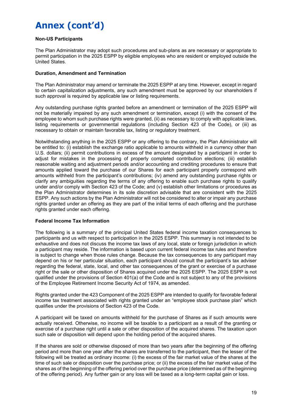 Annex (cont’d) 19 Non-US Participants The Plan Administrator may adopt such procedures and sub-plans as are necessary or appropriate to permit participation in the 2025 ESPP by eligible employees who are resident or employed outside the United States. Duration, Amendment and Termination The Plan Administrator may amend or terminate the 2025 ESPP at any time. However, except in regard to certain capitalization adjustments, any such amendment must be approved by our shareholders if such approval is required by applicable law or listing requirements. Any outstanding purchase rights granted before an amendment or termination of the 2025 ESPP will not be materially impaired by any such amendment or termination, except (i) with the consent of the employee to whom such purchase rights were granted, (ii) as necessary to comply with applicable laws, listing requirements or governmental regulations (including Section 423 of the Code), or (iii) as necessary to obtain or maintain favorable tax, listing or regulatory treatment. Notwithstanding anything in the 2025 ESPP or any offering to the contrary, the Plan Administrator will be entitled to: (i) establish the exchange ratio applicable to amounts withheld in a currency other than U.S. dollars; (ii) permit contributions in excess of the amount designated by a participant in order to adjust for mistakes in the processing of properly completed contribution elections; (iii) establish reasonable waiting and adjustment periods and/or accounting and crediting procedures to ensure that amounts applied toward the purchase of our Shares for each participant properly correspond with amounts withheld from the participant’s contributions; (iv) amend any outstanding purchase rights or clarify any ambiguities regarding the terms of any offering to enable such purchase rights to qualify under and/or comply with Section 423 of the Code; and (v) establish other limitations or procedures as the Plan Administrator determines in its sole discretion advisable that are consistent with the 2025 ESPP. Any such actions by the Plan Administrator will not be considered to alter or impair any purchase rights granted under an offering as they are part of the initial terms of each offering and the purchase rights granted under each offering. Federal Income Tax Information The following is a summary of the principal United States federal income taxation consequences to participants and us with respect to participation in the 2025 ESPP. This summary is not intended to be exhaustive and does not discuss the income tax laws of any local, state or foreign jurisdiction in which a participant may reside. The information is based upon current federal income tax rules and therefore is subject to change when those rules change. Because the tax consequences to any participant may depend on his or her particular situation, each participant should consult the participant’s tax adviser regarding the federal, state, local, and other tax consequences of the grant or exercise of a purchase right or the sale or other disposition of Shares acquired under the 2025 ESPP. The 2025 ESPP is not qualified under the provisions of Section 401(a) of the Code and is not subject to any of the provisions of the Employee Retirement Income Security Act of 1974, as amended. Rights granted under the 423 Component of the 2025 ESPP are intended to qualify for favorable federal income tax treatment associated with rights granted under an “employee stock purchase plan” which qualifies under the provisions of Section 423 of the Code. A participant will be taxed on amounts withheld for the purchase of Shares as if such amounts were actually received. Otherwise, no income will be taxable to a participant as a result of the granting or exercise of a purchase right until a sale or other disposition of the acquired shares. The taxation upon such sale or disposition will depend upon the holding period of the acquired shares. If the shares are sold or otherwise disposed of more than two years after the beginning of the offering period and more than one year after the shares are transferred to the participant, then the lesser of the following will be treated as ordinary income: (i) the excess of the fair market value of the shares at the time of such sale or disposition over the purchase price; or (ii) the excess of the fair market value of the shares as of the beginning of the offering period over the purchase price (determined as of the beginning of the offering period). Any further gain or any loss will be taxed as a long-term capital gain or loss.