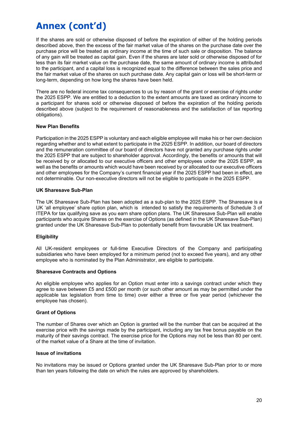 Annex (cont’d) 20 If the shares are sold or otherwise disposed of before the expiration of either of the holding periods described above, then the excess of the fair market value of the shares on the purchase date over the purchase price will be treated as ordinary income at the time of such sale or disposition. The balance of any gain will be treated as capital gain. Even if the shares are later sold or otherwise disposed of for less than its fair market value on the purchase date, the same amount of ordinary income is attributed to the participant, and a capital loss is recognized equal to the difference between the sales price and the fair market value of the shares on such purchase date. Any capital gain or loss will be short-term or long-term, depending on how long the shares have been held. There are no federal income tax consequences to us by reason of the grant or exercise of rights under the 2025 ESPP. We are entitled to a deduction to the extent amounts are taxed as ordinary income to a participant for shares sold or otherwise disposed of before the expiration of the holding periods described above (subject to the requirement of reasonableness and the satisfaction of tax reporting obligations). New Plan Benefits Participation in the 2025 ESPP is voluntary and each eligible employee will make his or her own decision regarding whether and to what extent to participate in the 2025 ESPP. In addition, our board of directors and the remuneration committee of our board of directors have not granted any purchase rights under the 2025 ESPP that are subject to shareholder approval. Accordingly, the benefits or amounts that will be received by or allocated to our executive officers and other employees under the 2025 ESPP, as well as the benefits or amounts which would have been received by or allocated to our executive officers and other employees for the Company’s current financial year if the 2025 ESPP had been in effect, are not determinable. Our non-executive directors will not be eligible to participate in the 2025 ESPP. UK Sharesave Sub-Plan The UK Sharesave Sub-Plan has been adopted as a sub-plan to the 2025 ESPP. The Sharesave is a UK ‘all employee’ share option plan, which is intended to satisfy the requirements of Schedule 3 of ITEPA for tax qualifying save as you earn share option plans. The UK Sharesave Sub-Plan will enable participants who acquire Shares on the exercise of Options (as defined in the UK Sharesave Sub-Plan) granted under the UK Sharesave Sub-Plan to potentially benefit from favourable UK tax treatment. Eligibility All UK-resident employees or full-time Executive Directors of the Company and participating subsidiaries who have been employed for a minimum period (not to exceed five years), and any other employee who is nominated by the Plan Administrator, are eligible to participate. Sharesave Contracts and Options An eligible employee who applies for an Option must enter into a savings contract under which they agree to save between £5 and £500 per month (or such other amount as may be permitted under the applicable tax legislation from time to time) over either a three or five year period (whichever the employee has chosen). Grant of Options The number of Shares over which an Option is granted will be the number that can be acquired at the exercise price with the savings made by the participant, including any tax free bonus payable on the maturity of their savings contract. The exercise price for the Options may not be less than 80 per cent. of the market value of a Share at the time of invitation. Issue of invitations No invitations may be issued or Options granted under the UK Sharesave Sub-Plan prior to or more than ten years following the date on which the rules are approved by shareholders.