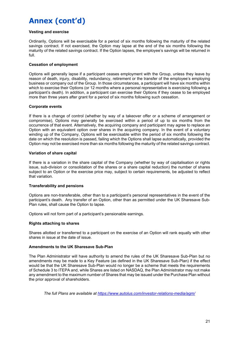 Annex (cont’d) 21 Vesting and exercise Ordinarily, Options will be exercisable for a period of six months following the maturity of the related savings contract. If not exercised, the Option may lapse at the end of the six months following the maturity of the related savings contract. If the Option lapses, the employee’s savings will be returned in full. Cessation of employment Options will generally lapse if a participant ceases employment with the Group, unless they leave by reason of death, injury, disability, redundancy, retirement or the transfer of the employee’s employing business or company out of the Group. In those circumstances, a participant will have six months within which to exercise their Options (or 12 months where a personal representative is exercising following a participant’s death). In addition, a participant can exercise their Options if they cease to be employed more than three years after grant for a period of six months following such cessation. Corporate events If there is a change of control (whether by way of a takeover offer or a scheme of arrangement or compromise), Options may generally be exercised within a period of up to six months from the occurrence of that event. Alternatively, the acquiring company and participant may agree to replace an Option with an equivalent option over shares in the acquiring company. In the event of a voluntary winding up of the Company, Options will be exercisable within the period of six months following the date on which the resolution is passed, failing which the Options shall lapse automatically, provided the Option may not be exercised more than six months following the maturity of the related savings contract. Variation of share capital If there is a variation in the share capital of the Company (whether by way of capitalisation or rights issue, sub-division or consolidation of the shares or a share capital reduction) the number of shares subject to an Option or the exercise price may, subject to certain requirements, be adjusted to reflect that variation. Transferability and pensions Options are non-transferable, other than to a participant’s personal representatives in the event of the participant’s death. Any transfer of an Option, other than as permitted under the UK Sharesave Sub- Plan rules, shall cause the Option to lapse. Options will not form part of a participant’s pensionable earnings. Rights attaching to shares Shares allotted or transferred to a participant on the exercise of an Option will rank equally with other shares in issue at the date of issue. Amendments to the UK Sharesave Sub-Plan The Plan Administrator will have authority to amend the rules of the UK Sharesave Sub-Plan but no amendments may be made to a Key Feature (as defined in the UK Sharesave Sub-Plan) if the effect would be that the UK Sharesave Sub-Plan would no longer be a scheme that meets the requirements of Schedule 3 to ITEPA and, while Shares are listed on NASDAQ, the Plan Administrator may not make any amendment to the maximum number of Shares that may be issued under the Purchase Plan without the prior approval of shareholders. The full Plans are available at https://www.autolus.com/investor-relations-media/agm/