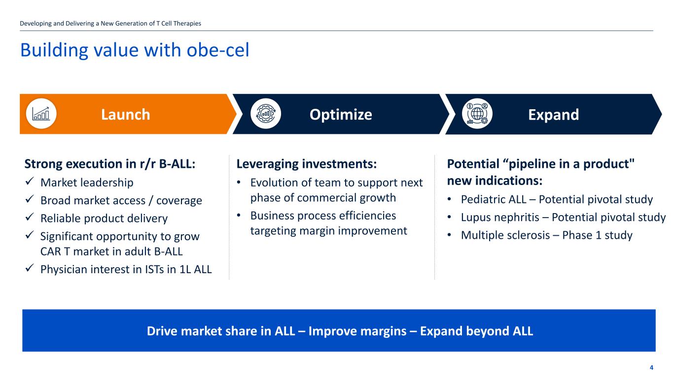 If the title goes over more than one line move the subtitle text box down by 1.15cm per additional line Agenda 3 • Welcome and Introduction: Amanda Cray, ED, Investor Relations & External Communications • Operational Highlights: Dr. Christian Itin, CEO • Financial Results: Rob Dolski, CFO • Upcoming Milestones and Conclusion: Dr. Christian Itin, CEO • Q&A: Dr. Christian Itin and Rob Dolski Developing and Delivering a New Generation of T Cell Therapies