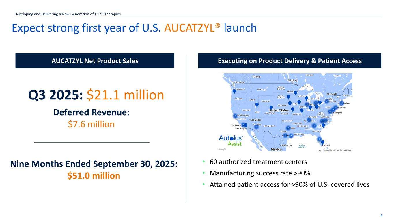 If the title goes over more than one line move the subtitle text box down by 1.15cm per additional line Disclaimer These slides contain forward-looking statements within the meaning of the “safe harbor” provisions of the Private Securities Litigation Reform Act of 1995. Forward-looking statements are statements that are not historical facts, and in some cases can be identified by terms such as “may,” “will,” “could,” “expects,” “plans,” “anticipates,” and “believes.” These statements include, but are not limited to: statements regarding Autolus’ development and commercialization of its product candidates; Autolus' manufacturing, sales and marketing plans for AUCATZYL, including expectations regarding the commercial launch in the United States and the ability to reach patients in a timely manner; the amount and timing of milestone payments under Autolus' collaboration and license agreements; and future development plans of obe-cel, including the timing or likelihood of expansion into additional markets or geographies and related regulatory approvals. Any forward-looking statements are based on management’s current views and assumptions and involve risks and uncertainties that could cause actual results, performance, or events to differ materially from those expressed or implied in such statements. Actual results and the timing of events could differ materially from those anticipated in such forward-looking statements as a result of various risks and uncertainties, which include, without limitation: Autolus' ability to maintain regulatory approval of AUCATZYL; its ability to execute its commercialization strategy for AUCATZYL; its ability to develop, manufacture and commercialize its other product candidates and the timing or likelihood of expansion of AUCATZYL into additional markets or geographies; Autolus' ability to maintain a commercial infrastructure and to successfully launch, market and sell AUCATZYL; actions of regulatory agencies, which may affect the initiation, timing and progress of clinical trials or future regulatory approval; the labelling for AUCATZYL/obe-cel in any future indication or patient population, if approved; the potential for payors to delay, limit or deny coverage for AUCATZYL; Autolus' ability to obtain, maintain and enforce intellectual property protection for AUCATZYL or any product candidates it is developing; the results of clinical trials are not always being predictive of future results; the cost, timing and results of clinical trials; that many product candidates do not become approved drugs on a timely or cost effective basis or at all; the ability to enroll patients in clinical trials; and possible safety and efficacy concerns. For a discussion of other risks and uncertainties, and other important factors, any of which could cause Autolus’ actual results to differ from those contained in the forward-looking statements, see the section titled “Risk Factors” in Autolus' Annual Report on Form 10-K filed with the Securities and Exchange Commission, or the SEC, on March 20, 2025, as well as discussions of potential risks, uncertainties, and other important factors in Autolus’ subsequent filings with the Securities and Exchange Commission. All information in this presentation is as of the date of the presentation, and Autolus undertakes no obligation to publicly update any forward-looking statement, whether as a result of new information, future events, or otherwise, except as required by law. You should, therefore, not rely on these forward-looking statements as representing the Company’s views as of any date subsequent to the date of this presentation. 2 Developing and Delivering a New Generation of T Cell Therapies