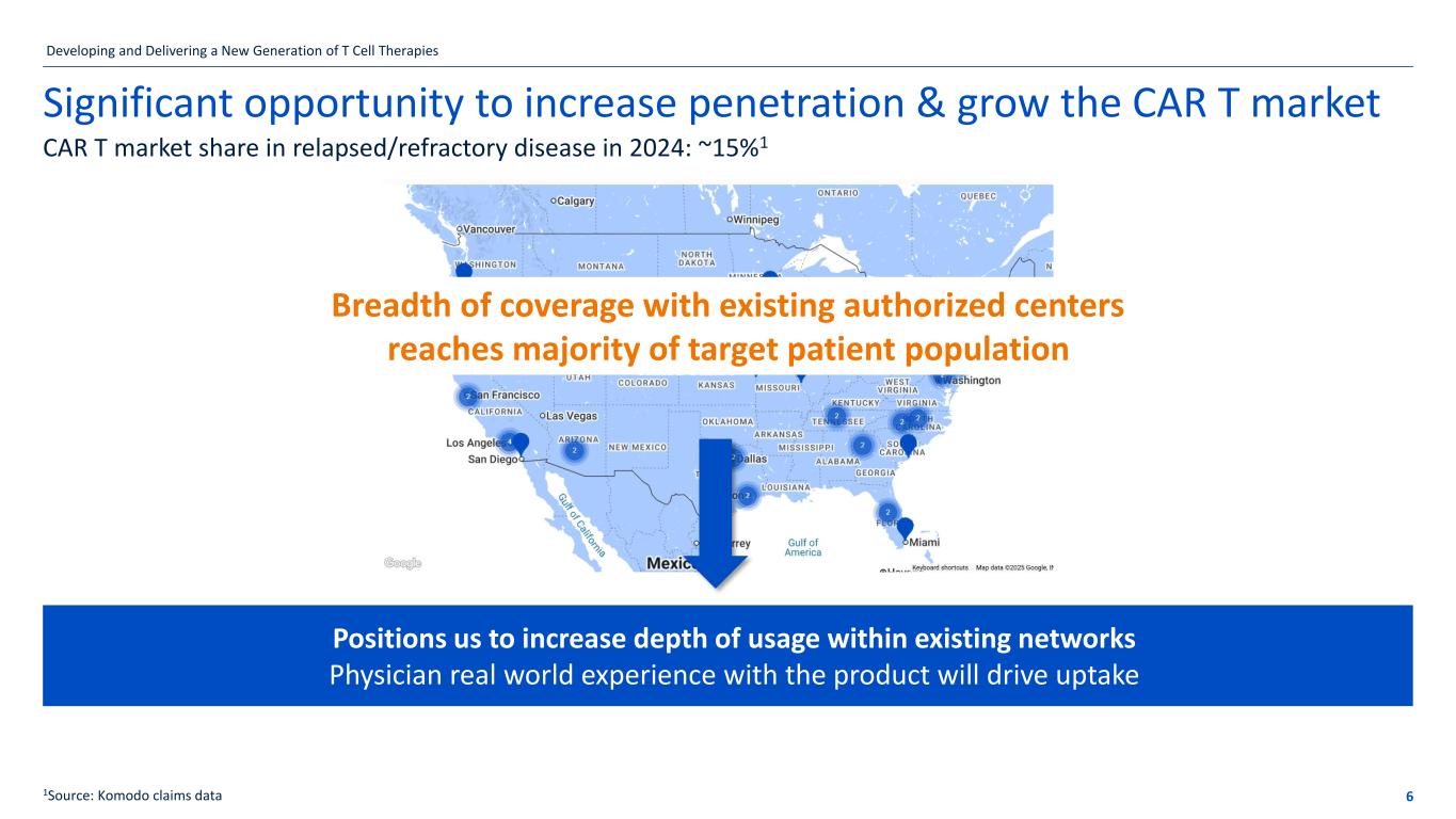 If the title goes over more than one line move the subtitle text box down by 1.15cm per additional line 5 Expect strong first year of U.S. AUCATZYL® launch Executing on Product Delivery & Patient AccessAUCATZYL Net Product Sales Q3 2025: $21.1 million • 60 authorized treatment centers • Manufacturing success rate >90% • Attained patient access for >90% of U.S. covered lives Developing and Delivering a New Generation of T Cell Therapies Deferred Revenue: $7.6 million Nine Months Ended September 30, 2025: $51.0 million