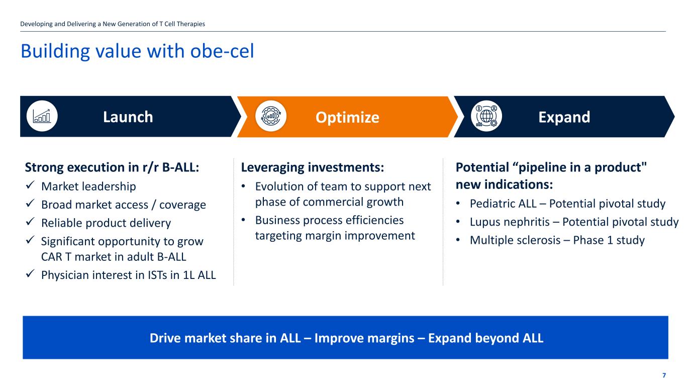 If the title goes over more than one line move the subtitle text box down by 1.15cm per additional line Significant opportunity to increase penetration & grow the CAR T market 6 CAR T market share in relapsed/refractory disease in 2024: ~15%1 1Source: Komodo claims data Developing and Delivering a New Generation of T Cell Therapies Positions us to increase depth of usage within existing networks Physician real world experience with the product will drive uptake Breadth of coverage with existing authorized centers reaches majority of target patient population
