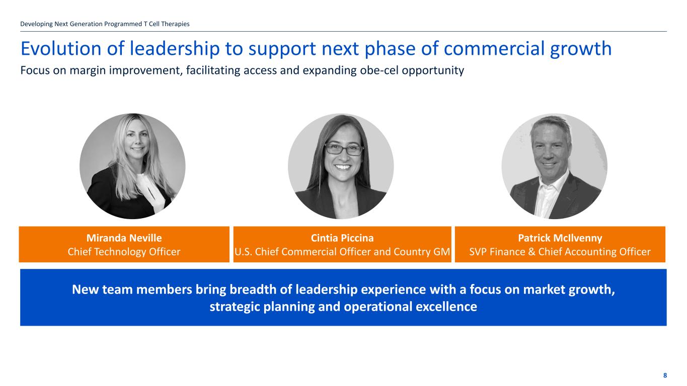 If the title goes over more than one line move the subtitle text box down by 1.15cm per additional line 7 Developing and Delivering a New Generation of T Cell Therapies Drive market share in ALL – Improve margins – Expand beyond ALL Building value with obe-cel Strong execution in r/r B-ALL: ✓ Market leadership ✓ Broad market access / coverage ✓ Reliable product delivery ✓ Significant opportunity to grow CAR T market in adult B-ALL ✓ Physician interest in ISTs in 1L ALL Leveraging investments: • Evolution of team to support next phase of commercial growth • Business process efficiencies targeting margin improvement Potential “pipeline in a product" new indications: • Pediatric ALL – Potential pivotal study • Lupus nephritis – Potential pivotal study • Multiple sclerosis – Phase 1 study ExpandLaunch Optimize