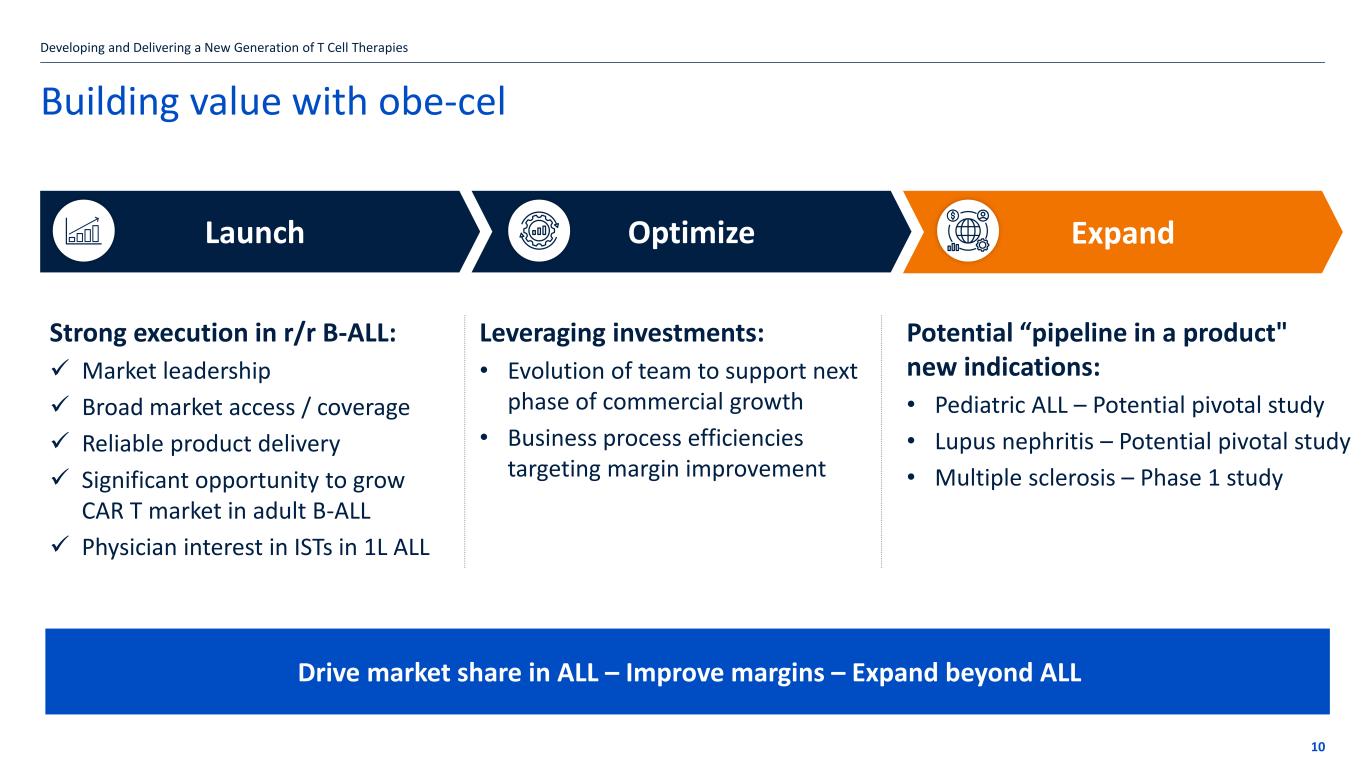 If the title goes over more than one line move the subtitle text box down by 1.15cm per additional line 9 Initiatives to drive efficiencies and cost savings Developing Next Generation Programmed T Cell Therapies Foundation is a strong launch performance with highly reliable product supply Streamline processes Simplify Optimize Automation Innovate Manufacturing & Market access Key initiatives Streamline – Optimize – Innovate