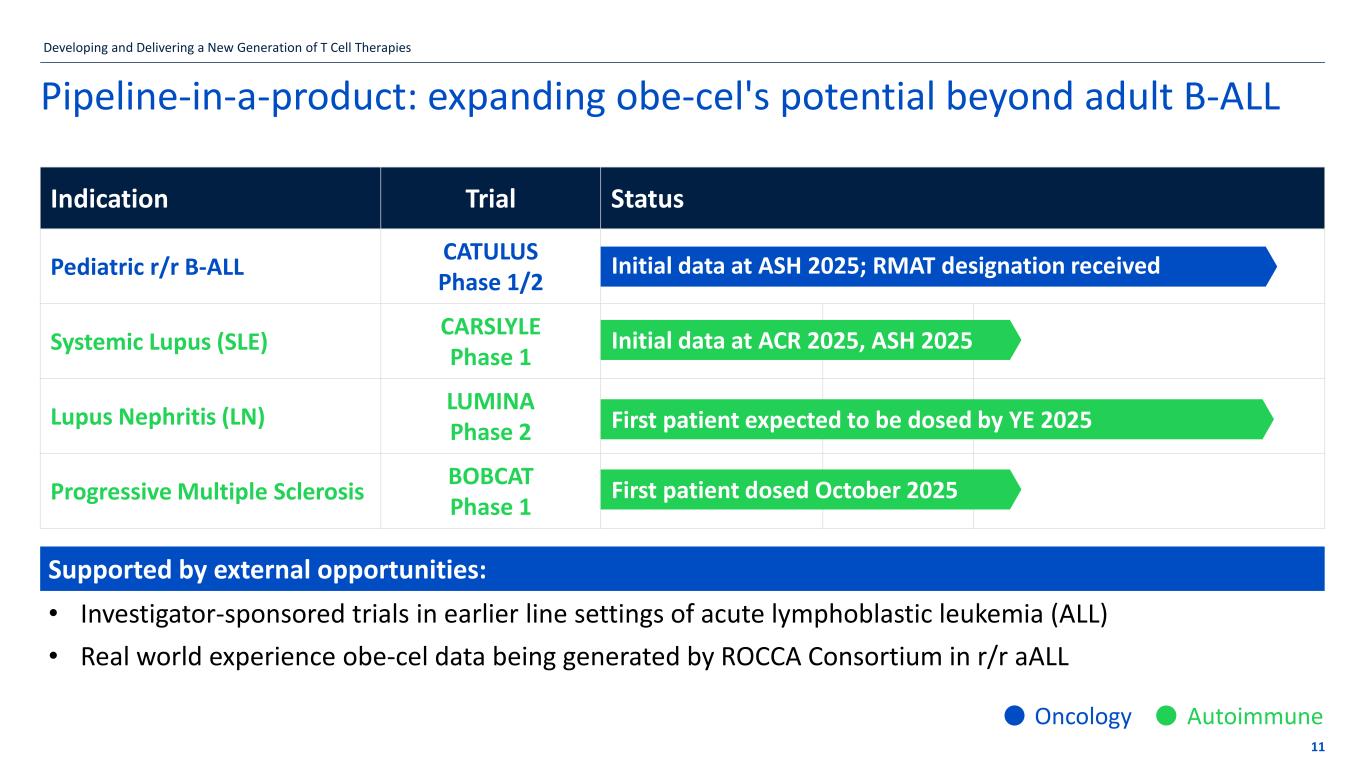 If the title goes over more than one line move the subtitle text box down by 1.15cm per additional line 10 Developing and Delivering a New Generation of T Cell Therapies Drive market share in ALL – Improve margins – Expand beyond ALL Building value with obe-cel Strong execution in r/r B-ALL: ✓ Market leadership ✓ Broad market access / coverage ✓ Reliable product delivery ✓ Significant opportunity to grow CAR T market in adult B-ALL ✓ Physician interest in ISTs in 1L ALL Leveraging investments: • Evolution of team to support next phase of commercial growth • Business process efficiencies targeting margin improvement Potential “pipeline in a product" new indications: • Pediatric ALL – Potential pivotal study • Lupus nephritis – Potential pivotal study • Multiple sclerosis – Phase 1 study ExpandLaunch Optimize