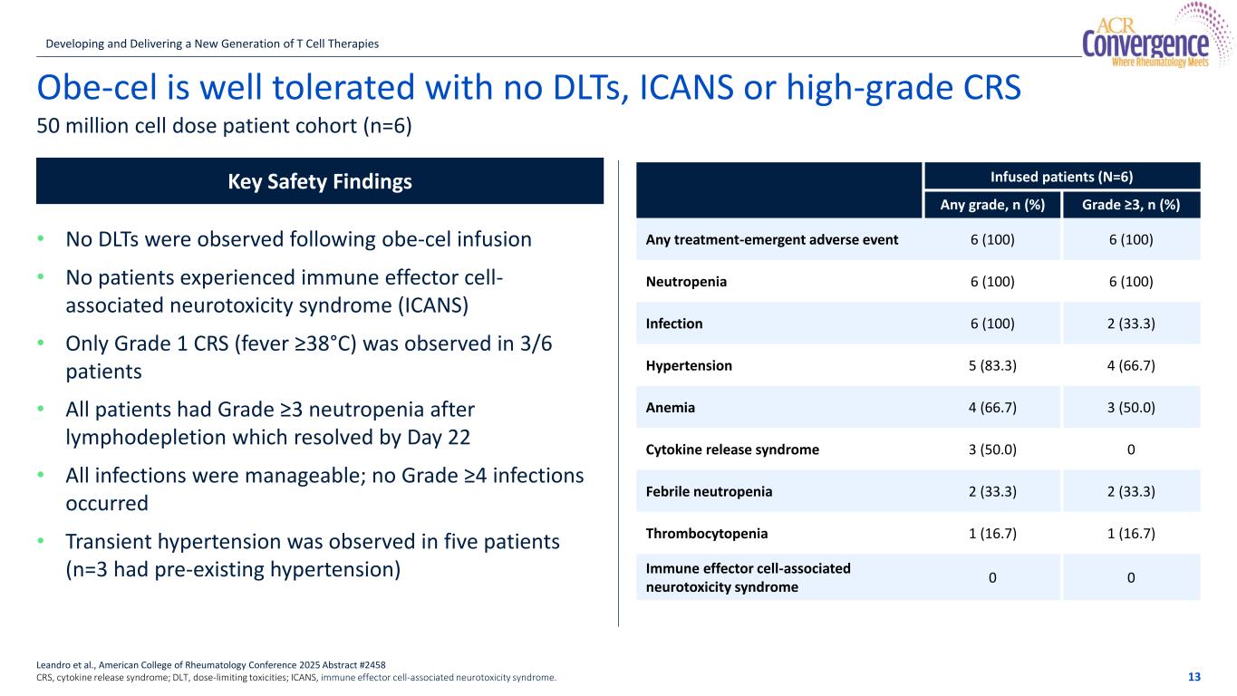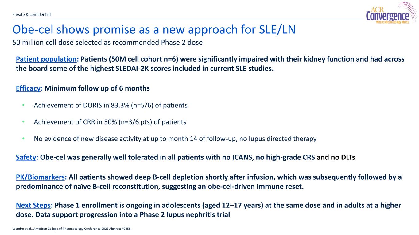 Obe-cel shows promise as a new approach for SLE/LN Patient population: Patients (50M cell cohort n=6) were significantly impaired with their kidney function and had across the board some of the highest SLEDAI-2K scores included in current SLE studies. Efficacy: Minimum follow up of 6 months • Achievement of DORIS in 83.3% (n=5/6) of patients • Achievement of CRR in 50% (n=3/6 pts) of patients • No evidence of new disease activity at up to month 14 of follow-up, no lupus directed therapy Safety: Obe-cel was generally well tolerated in all patients with no ICANS, no high-grade CRS and no DLTs PK/Biomarkers: All patients showed deep B-cell depletion shortly after infusion, which was subsequently followed by a predominance of naïve B-cell reconstitution, suggesting an obe-cel-driven immune reset. Next Steps: Phase 1 enrollment is ongoing in adolescents (aged 12–17 years) at the same dose and in adults at a higher dose. Data support progression into a Phase 2 lupus nephritis trial Private & confidential 50 million cell dose selected as recommended Phase 2 dose Leandro et al., American College of Rheumatology Conference 2025 Abstract #2458 12