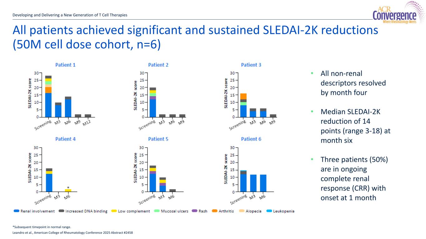 All patients achieved significant and sustained SLEDAI-2K reductions (50M cell dose cohort, n=6) Developing and Delivering a New Generation of T Cell Therapies 14 *Subsequent timepoint in normal range. Leandro et al., American College of Rheumatology Conference 2025 Abstract #2458 • All non-renal descriptors resolved by month four • Median SLEDAI-2K reduction of 14 points (range 3-18) at month six • Three patients (50%) are in ongoing complete renal response (CRR) with onset at 1 month 14