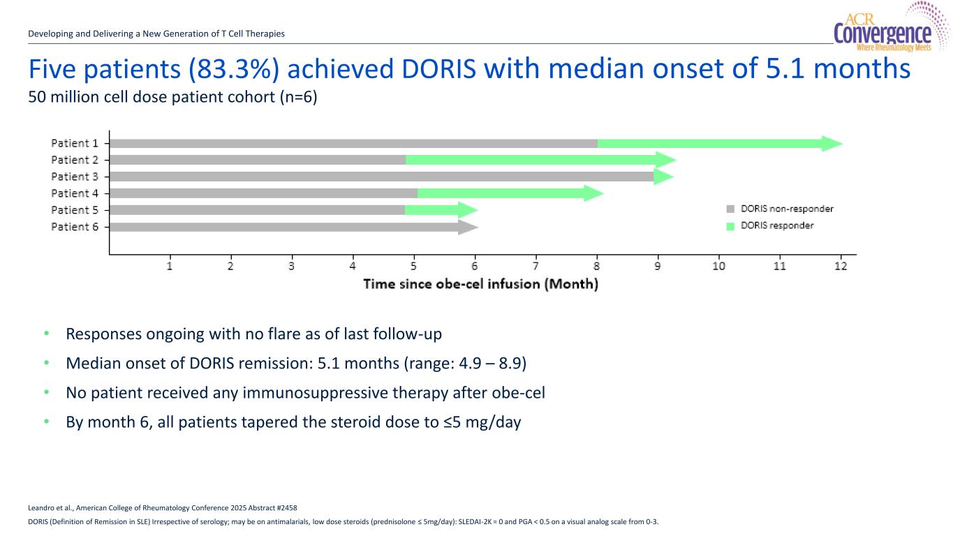 Five patients (83.3%) achieved DORIS with median onset of 5.1 months Developing and Delivering a New Generation of T Cell Therapies 50 million cell dose patient cohort (n=6) Leandro et al., American College of Rheumatology Conference 2025 Abstract #2458 DORIS (Definition of Remission in SLE) Irrespective of serology; may be on antimalarials, low dose steroids (prednisolone ≤ 5mg/day): SLEDAI-2K = 0 and PGA < 0.5 on a visual analog scale from 0-3. • Responses ongoing with no flare as of last follow-up • Median onset of DORIS remission: 5.1 months (range: 4.9 – 8.9) • No patient received any immunosuppressive therapy after obe-cel • By month 6, all patients tapered the steroid dose to ≤5 mg/day 15