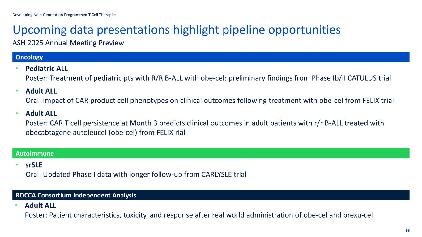If the title goes over more than one line move the subtitle text box down by 1.15cm per additional line Upcoming data presentations highlight pipeline opportunities Developing Next Generation Programmed T Cell Therapies ASH 2025 Annual Meeting Preview Oncology • Pediatric ALL Poster: Treatment of pediatric pts with R/R B-ALL with obe-cel: preliminary findings from Phase Ib/II CATULUS trial • Adult ALL Oral: Impact of CAR product cell phenotypes on clinical outcomes following treatment with obe-cel from FELIX trial • Adult ALL Poster: CAR T cell persistence at Month 3 predicts clinical outcomes in adult patients with r/r B-ALL treated with obecabtagene autoleucel (obe-cel) from FELIX rial Autoimmune • srSLE Oral: Updated Phase I data with longer follow-up from CARLYSLE trial 16 • Adult ALL Poster: Patient characteristics, toxicity, and response after real world administration of obe-cel and brexu-cel ROCCA Consortium Independent Analysis