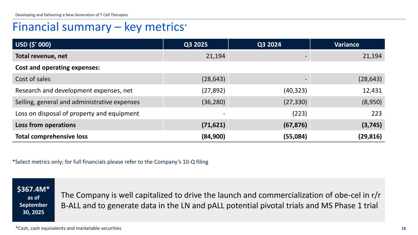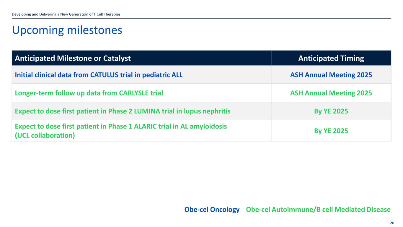 If the title goes over more than one line move the subtitle text box down by 1.15cm per additional line Financial summary – key metrics* USD ($’ 000) Q3 2025 Q3 2024 Variance Total revenue, net 21,194 - 21,194 Cost and operating expenses: Cost of sales (28,643) - (28,643) Research and development expenses, net (27,892) (40,323) 12,431 Selling, general and administrative expenses (36,280) (27,330) (8,950) Loss on disposal of property and equipment - (223) 223 Loss from operations (71,621) (67,876) (3,745) Total comprehensive loss (84,900) (55,084) (29,816) 18 *Select metrics only; for full financials please refer to the Company’s 10-Q filing The Company is well capitalized to drive the launch and commercialization of obe-cel in r/r B-ALL and to generate data in the LN and pALL potential pivotal trials and MS Phase 1 trial $367.4M* as of September 30, 2025 *Cash, cash equivalents and marketable securities Developing and Delivering a New Generation of T Cell Therapies