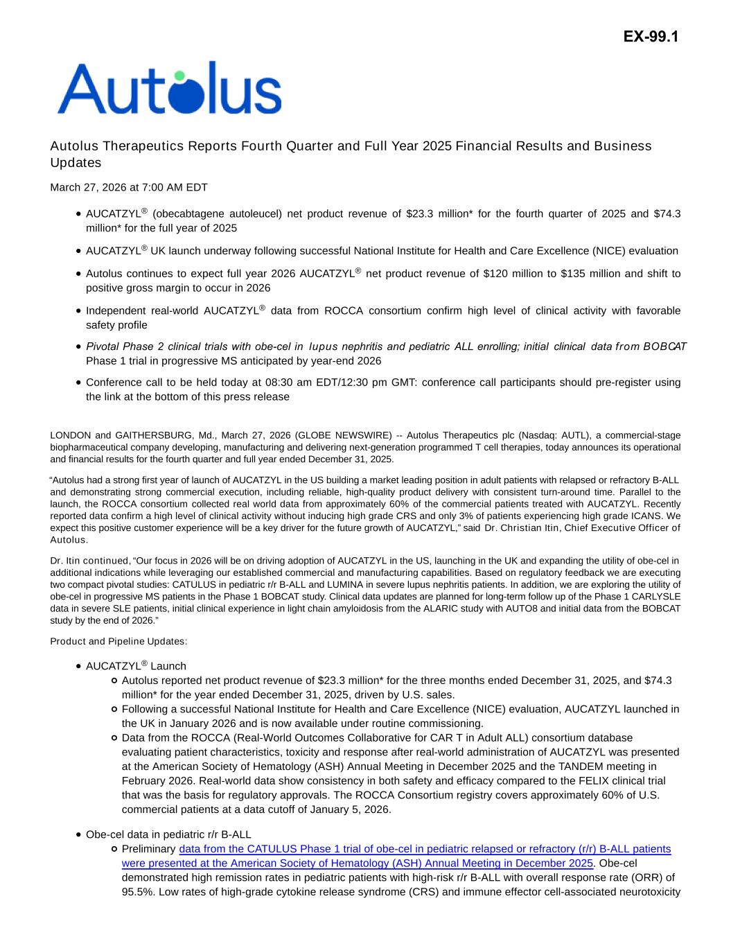 Autolus Therapeutics Reports Fourth Quarter and Full Year 2025 Financial Results and Business Updates  March 27, 2026 at 7:00 AM EDT AUCATZYL® (obecabtagene autoleucel) net product revenue of $23.3 million* for the fourth quarter of 2025 and $74.3 million* for the full year of 2025 AUCATZYL® UK launch underway following successful National Institute for Health and Care Excellence (NICE) evaluation Autolus continues to expect full year 2026 AUCATZYL® net product revenue of $120 million to $135 million and shift to positive gross margin to occur in 2026 Independent real-world AUCATZYL® data from ROCCA consortium confirm high level of clinical activity with favorable safety profile Pivotal Phase 2 clinical trials with obe-cel in ​ lupus nephritis and pediatric ALL enrolling; initial clinical data from BOBCAT Phase 1 trial in progressive MS anticipated by year-end 2026 Conference call to be held today at 08:30 am EDT/12:30 pm GMT: conference call participants should pre-register using the link at the bottom of this press release LONDON and GAITHERSBURG, Md., March 27, 2026 (GLOBE NEWSWIRE) -- Autolus Therapeutics plc (Nasdaq: AUTL), a commercial-stage biopharmaceutical company developing, manufacturing and delivering next-generation programmed T cell therapies, today announces its operational and financial results for the fourth quarter and full year ended December 31, 2025. “Autolus had a strong first year of launch of AUCATZYL in the US building a market leading position in adult patients with relapsed or refractory B-ALL and demonstrating strong commercial execution, including reliable, high-quality product delivery with consistent turn-around time. Parallel to the launch, the ROCCA consortium collected real world data from approximately 60% of the commercial patients treated with AUCATZYL. Recently reported data confirm a high level of clinical activity without inducing high grade CRS and only 3% of patients experiencing high grade ICANS. We expect this positive customer experience will be a key driver for the future growth of AUCATZYL,” said Dr. Christian Itin, Chief Executive Officer of Autolus. Dr. Itin continued, “Our focus in 2026 will be on driving adoption of AUCATZYL in the US, launching in the UK and expanding the utility of obe-cel in additional indications while leveraging our established commercial and manufacturing capabilities. Based on regulatory feedback we are executing two compact pivotal studies: CATULUS in pediatric r/r B-ALL and LUMINA in severe lupus nephritis patients. In addition, we are exploring the utility of obe-cel in progressive MS patients in the Phase 1 BOBCAT study. Clinical data updates are planned for long-term follow up of the Phase 1 CARLYSLE data in severe SLE patients, initial clinical experience in light chain amyloidosis from the ALARIC study with AUTO8 and initial data from the BOBCAT study by the end of 2026.” Product and Pipeline Updates: AUCATZYL® Launch Autolus reported net product revenue of $23.3 million* for the three months ended December 31, 2025, and $74.3 million* for the year ended December 31, 2025, driven by U.S. sales. Following a successful National Institute for Health and Care Excellence (NICE) evaluation, AUCATZYL launched in the UK in January 2026 and is now available under routine commissioning. Data from the ROCCA (Real-World Outcomes Collaborative for CAR T in Adult ALL) consortium database evaluating patient characteristics, toxicity and response after real-world administration of AUCATZYL was presented at the American Society of Hematology (ASH) Annual Meeting in December 2025 and the TANDEM meeting in February 2026. Real-world data show consistency in both safety and efficacy compared to the FELIX clinical trial that was the basis for regulatory approvals. The ROCCA Consortium registry covers approximately 60% of U.S. commercial patients at a data cutoff of January 5, 2026. Obe-cel data in pediatric r/r B-ALL Preliminary data from the CATULUS Phase 1 trial of obe-cel in pediatric relapsed or refractory (r/r) B-ALL patients were presented at the American Society of Hematology (ASH) Annual Meeting in December 2025. Obe-cel demonstrated high remission rates in pediatric patients with high-risk r/r B-ALL with overall response rate (ORR) of 95.5%. Low rates of high-grade cytokine release syndrome (CRS) and immune effector cell-associated neurotoxicity EX-99.1