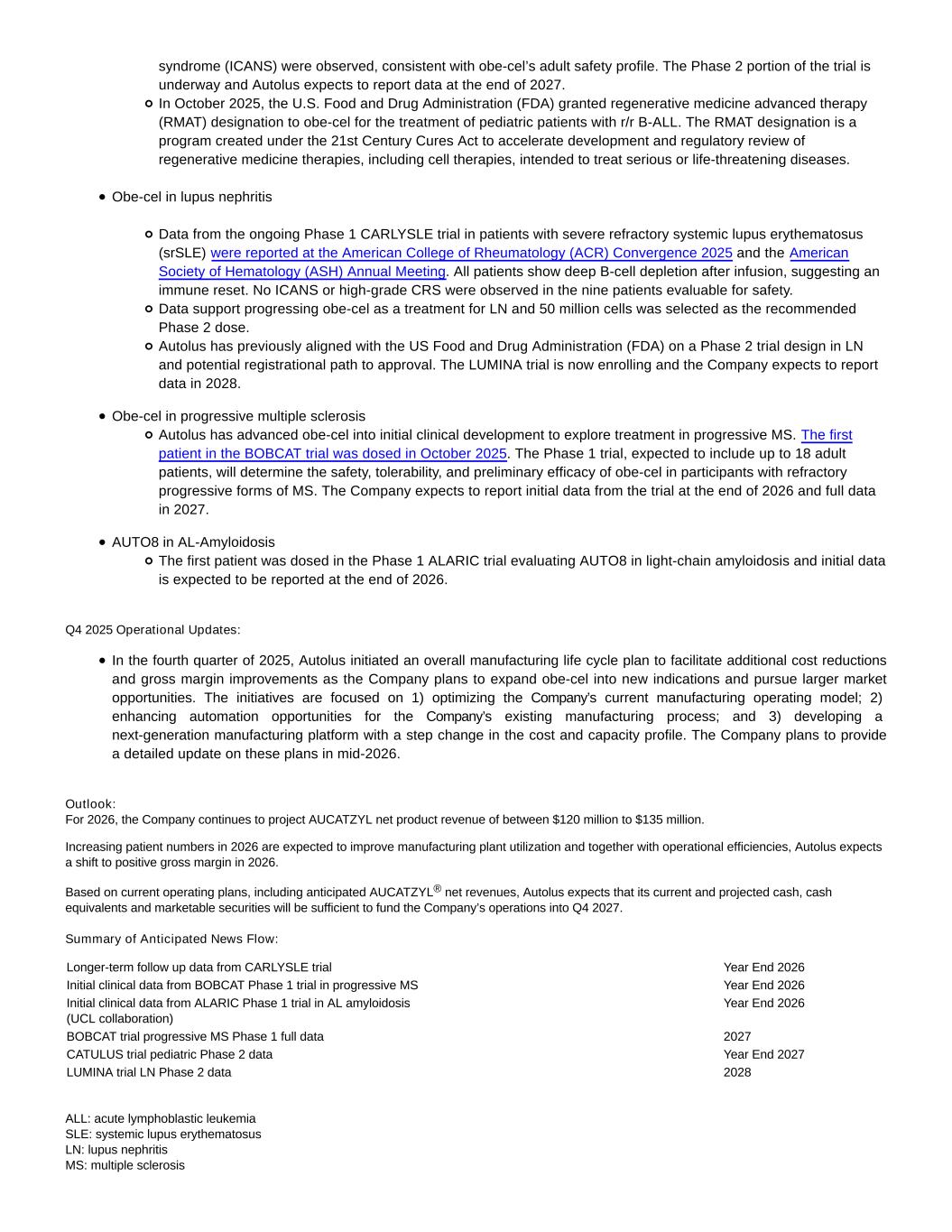 syndrome (ICANS) were observed, consistent with obe-cel’s adult safety profile. The Phase 2 portion of the trial is underway and Autolus expects to report data at the end of 2027. In October 2025, the U.S. Food and Drug Administration (FDA) granted regenerative medicine advanced therapy (RMAT) designation to obe-cel for the treatment of pediatric patients with r/r B-ALL. The RMAT designation is a program created under the 21st Century Cures Act to accelerate development and regulatory review of regenerative medicine therapies, including cell therapies, intended to treat serious or life-threatening diseases. Obe-cel in lupus nephritis Data from the ongoing Phase 1 CARLYSLE trial in patients with severe refractory systemic lupus erythematosus (srSLE) were reported at the American College of Rheumatology (ACR) Convergence 2025 and the American Society of Hematology (ASH) Annual Meeting. All patients show deep B-cell depletion after infusion, suggesting an immune reset. No ICANS or high-grade CRS were observed in the nine patients evaluable for safety. Data support progressing obe-cel as a treatment for LN and 50 million cells was selected as the recommended Phase 2 dose. Autolus has previously aligned with the US Food and Drug Administration (FDA) on a Phase 2 trial design in LN and potential registrational path to approval. The LUMINA trial is now enrolling and the Company expects to report data in 2028. Obe-cel in progressive multiple sclerosis Autolus has advanced obe-cel into initial clinical development to explore treatment in progressive MS. The first patient in the BOBCAT trial was dosed in October 2025. The Phase 1 trial, expected to include up to 18 adult patients, will determine the safety, tolerability, and preliminary efficacy of obe-cel in participants with refractory progressive forms of MS. The Company expects to report initial data from the trial at the end of 2026 and full data in 2027. AUTO8 in AL-Amyloidosis The first patient was dosed in the Phase 1 ALARIC trial evaluating AUTO8 in light-chain amyloidosis and initial data is expected to be reported at the end of 2026. Q4 2025 Operational Updates: In the fourth quarter of 2025, Autolus initiated an overall manufacturing life cycle plan to facilitate additional cost reductions and gross margin improvements as the Company plans to expand obe-cel into new indications and pursue larger market opportunities. The initiatives are focused on 1) optimizing the Company’s current manufacturing operating model; 2) enhancing automation opportunities for the Company’s existing manufacturing process; and 3) developing a next-generation manufacturing platform with a step change in the cost and capacity profile. The Company plans to provide a detailed update on these plans in mid-2026. Outlook: For 2026, the Company continues to project AUCATZYL net product revenue of between $120 million to $135 million. Increasing patient numbers in 2026 are expected to improve manufacturing plant utilization and together with operational efficiencies, Autolus expects a shift to positive gross margin in 2026. Based on current operating plans, including anticipated AUCATZYL® net revenues, Autolus expects that its current and projected cash, cash equivalents and marketable securities will be sufficient to fund the Company’s operations into Q4 2027. Summary of Anticipated News Flow: Longer-term follow up data from CARLYSLE trial Year End 2026 Initial clinical data from BOBCAT Phase 1 trial in progressive MS Year End 2026 Initial clinical data from ALARIC Phase 1 trial in AL amyloidosis (UCL collaboration) Year End 2026 BOBCAT trial progressive MS Phase 1 full data 2027 CATULUS trial pediatric Phase 2 data Year End 2027 LUMINA trial LN Phase 2 data 2028     ALL: acute lymphoblastic leukemia SLE: systemic lupus erythematosus LN: lupus nephritis MS: multiple sclerosis