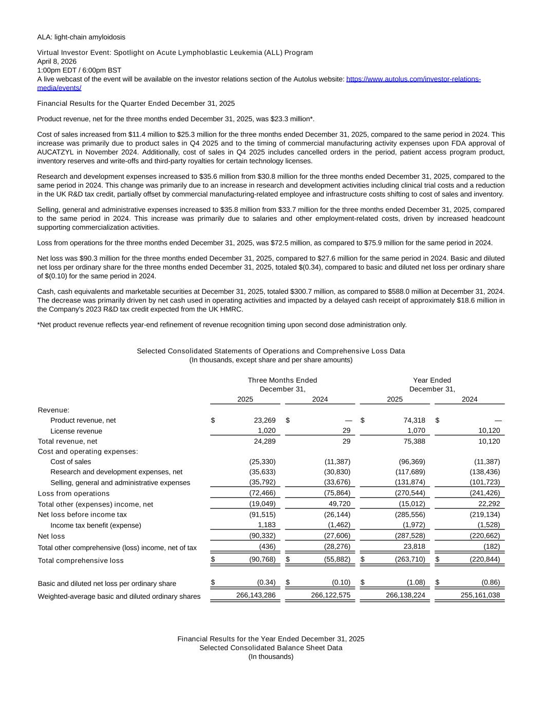 ALA: light-chain amyloidosis Virtual Investor Event: Spotlight on Acute Lymphoblastic Leukemia (ALL) Program April 8, 2026 1:00pm EDT / 6:00pm BST A live webcast of the event will be available on the investor relations section of the Autolus website: https://www.autolus.com/investor-relations- media/events/ Financial Results for the Quarter Ended December 31, 2025 Product revenue, net for the three months ended December 31, 2025, was $23.3 million*. Cost of sales increased from $11.4 million to $25.3 million for the three months ended December 31, 2025, compared to the same period in 2024. This increase was primarily due to product sales in Q4 2025 and to the timing of commercial manufacturing activity expenses upon FDA approval of AUCATZYL in November 2024. Additionally, cost of sales in Q4 2025 includes cancelled orders in the period, patient access program product, inventory reserves and write-offs and third-party royalties for certain technology licenses. Research and development expenses increased to $35.6 million from $30.8 million for the three months ended December 31, 2025, compared to the same period in 2024. This change was primarily due to an increase in research and development activities including clinical trial costs and a reduction in the UK R&D tax credit, partially offset by commercial manufacturing-related employee and infrastructure costs shifting to cost of sales and inventory. Selling, general and administrative expenses increased to $35.8 million from $33.7 million for the three months ended December 31, 2025, compared to the same period in 2024. This increase was primarily due to salaries and other employment-related costs, driven by increased headcount supporting commercialization activities. Loss from operations for the three months ended December 31, 2025, was $72.5 million, as compared to $75.9 million for the same period in 2024. Net loss was $90.3 million for the three months ended December 31, 2025, compared to $27.6 million for the same period in 2024. Basic and diluted net loss per ordinary share for the three months ended December 31, 2025, totaled $(0.34), compared to basic and diluted net loss per ordinary share of $(0.10) for the same period in 2024. Cash, cash equivalents and marketable securities at December 31, 2025, totaled $300.7 million, as compared to $588.0 million at December 31, 2024. The decrease was primarily driven by net cash used in operating activities and impacted by a delayed cash receipt of approximately $18.6 million in the Company's 2023 R&D tax credit expected from the UK HMRC. *Net product revenue reflects year-end refinement of revenue recognition timing upon second dose administration only.   Selected Consolidated Statements of Operations and Comprehensive Loss Data (In thousands, except share and per share amounts)               Three Months Ended December 31,   Year Ended December 31,       2025       2024       2025       2024   Revenue:                 Product revenue, net   $ 23,269    $ —    $ 74,318    $ —  License revenue     1,020      29      1,070      10,120  Total revenue, net     24,289      29      75,388      10,120  Cost and operating expenses:                 Cost of sales     (25,330)      (11,387)      (96,369)      (11,387)  Research and development expenses, net     (35,633)      (30,830)      (117,689)      (138,436)  Selling, general and administrative expenses     (35,792)      (33,676)      (131,874)      (101,723)  Loss from operations     (72,466)      (75,864)      (270,544)      (241,426)  Total other (expenses) income, net     (19,049)      49,720      (15,012)      22,292  Net loss before income tax     (91,515)      (26,144)      (285,556)      (219,134)  Income tax benefit (expense)     1,183      (1,462)      (1,972)      (1,528)  Net loss     (90,332)      (27,606)      (287,528)      (220,662)  Total other comprehensive (loss) income, net of tax     (436)      (28,276)      23,818      (182)  Total comprehensive loss   $ (90,768)    $ (55,882)    $ (263,710)    $ (220,844)                    Basic and diluted net loss per ordinary share   $ (0.34)    $ (0.10)    $ (1.08)    $ (0.86)  Weighted-average basic and diluted ordinary shares     266,143,286      266,122,575      266,138,224      255,161,038  Financial Results for the Year Ended December 31, 2025 Selected Consolidated Balance Sheet Data (In thousands)