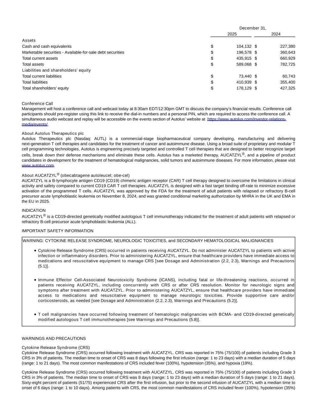 December 31,         2025     2024 Assets           Cash and cash equivalents     $ 104,132  $ 227,380 Marketable securities - Available-for-sale debt securities     $ 196,578  $ 360,643 Total current assets     $ 435,915  $ 660,929 Total assets     $ 589,068  $ 782,725 Liabilities and shareholders' equity           Total current liabilities     $ 73,440  $ 60,743 Total liabilities     $ 410,939  $ 355,400 Total shareholders' equity     $ 178,129  $ 427,325                 Conference Call Management will host a conference call and webcast today at 8:30am EDT/12:30pm GMT to discuss the company’s financial results. Conference call participants should pre-register using this link to receive the dial-in numbers and a personal PIN, which are required to access the conference call. A simultaneous audio webcast and replay will be accessible on the events section of Autolus’ website at https://www.autolus.com/investor-relations- media/events/. About Autolus Therapeutics plc Autolus Therapeutics plc   (Nasdaq: AUTL) is a commercial-stage biopharmaceutical company developing, manufacturing and delivering next-generation T cell therapies and candidates for the treatment of cancer and autoimmune disease. Using a broad suite of proprietary and modular T cell programming technologies, Autolus is engineering precisely targeted and controlled T cell therapies that are designed to better recognize target cells, break down their defense mechanisms and eliminate these cells. Autolus has a marketed therapy, AUCATZYL®, and a pipeline of product candidates in development for the treatment of hematological malignancies, solid tumors and autoimmune diseases. For more information, please visit www.autolus.com. About AUCATZYL® (obecabtagene autoleucel; obe-cel) AUCATZYL is a B-lymphocyte antigen CD19 (CD19) chimeric antigen receptor (CAR) T cell therapy designed to overcome the limitations in clinical activity and safety compared to current CD19 CAR T cell therapies. AUCATZYL is designed with a fast target binding off-rate to minimize excessive activation of the programmed T cells. AUCATZYL was approved by the FDA for the treatment of adult patients with relapsed or refractory B-cell precursor acute lymphoblastic leukemia on November 8, 2024, and was granted conditional marketing authorization by MHRA in the UK and EMA in the EU in 2025. INDICATION  AUCATZYL® is a CD19-directed genetically modified autologous T cell immunotherapy indicated for the treatment of adult patients with relapsed or refractory B-cell precursor acute lymphoblastic leukemia (ALL).  IMPORTANT SAFETY INFORMATION  WARNING: CYTOKINE RELEASE SYNDROME, NEUROLOGIC TOXICITIES, and SECONDARY HEMATOLOGICAL MALIGNANCIES Cytokine Release Syndrome (CRS) occurred in patients receiving AUCATZYL. Do not administer AUCATZYL to patients with active infection or inflammatory disorders. Prior to administering AUCATZYL, ensure that healthcare providers have immediate access to medications and resuscitative equipment to manage CRS [see Dosage and Administration (2.2, 2.3), Warnings and Precautions (5.1)]. Immune Effector Cell-Associated Neurotoxicity Syndrome (ICANS), including fatal or life-threatening reactions, occurred in patients receiving AUCATZYL, including concurrently with CRS or after CRS resolution. Monitor for neurologic signs and symptoms after treatment with AUCATZYL. Prior to administering AUCATZYL, ensure that healthcare providers have immediate access to medications and resuscitative equipment to manage neurologic toxicities. Provide supportive care and/or corticosteroids, as needed [see Dosage and Administration (2.2, 2.3), Warnings and Precautions (5.2)]. T cell malignancies have occurred following treatment of hematologic malignancies with BCMA- and CD19-directed genetically modified autologous T cell immunotherapies [see Warnings and Precautions (5.8)]. WARNINGS AND PRECAUTIONS  Cytokine Release Syndrome (CRS)  Cytokine Release Syndrome (CRS) occurred following treatment with AUCATZYL. CRS was reported in 75% (75/100) of patients including Grade 3 CRS in 3% of patients. The median time to onset of CRS was 8 days following the first infusion (range: 1 to 23 days) with a median duration of 5 days (range: 1 to 21 days). The most common manifestations of CRS included fever (100%), hypotension (35%), and hypoxia (19%).  Cytokine Release Syndrome (CRS) occurred following treatment with AUCATZYL. CRS was reported in 75% (75/100) of patients including Grade 3 CRS in 3% of patients. The median time to onset of CRS was 8 days (range: 1 to 23 days) with a median duration of 5 days (range: 1 to 21 days). Sixty-eight percent of patients (51/75) experienced CRS after the first infusion, but prior to the second infusion of AUCATZYL with a median time to onset of 6 days (range: 1 to 10 days). Among patients with CRS, the most common manifestations of CRS included fever (100%), hypotension (35%)