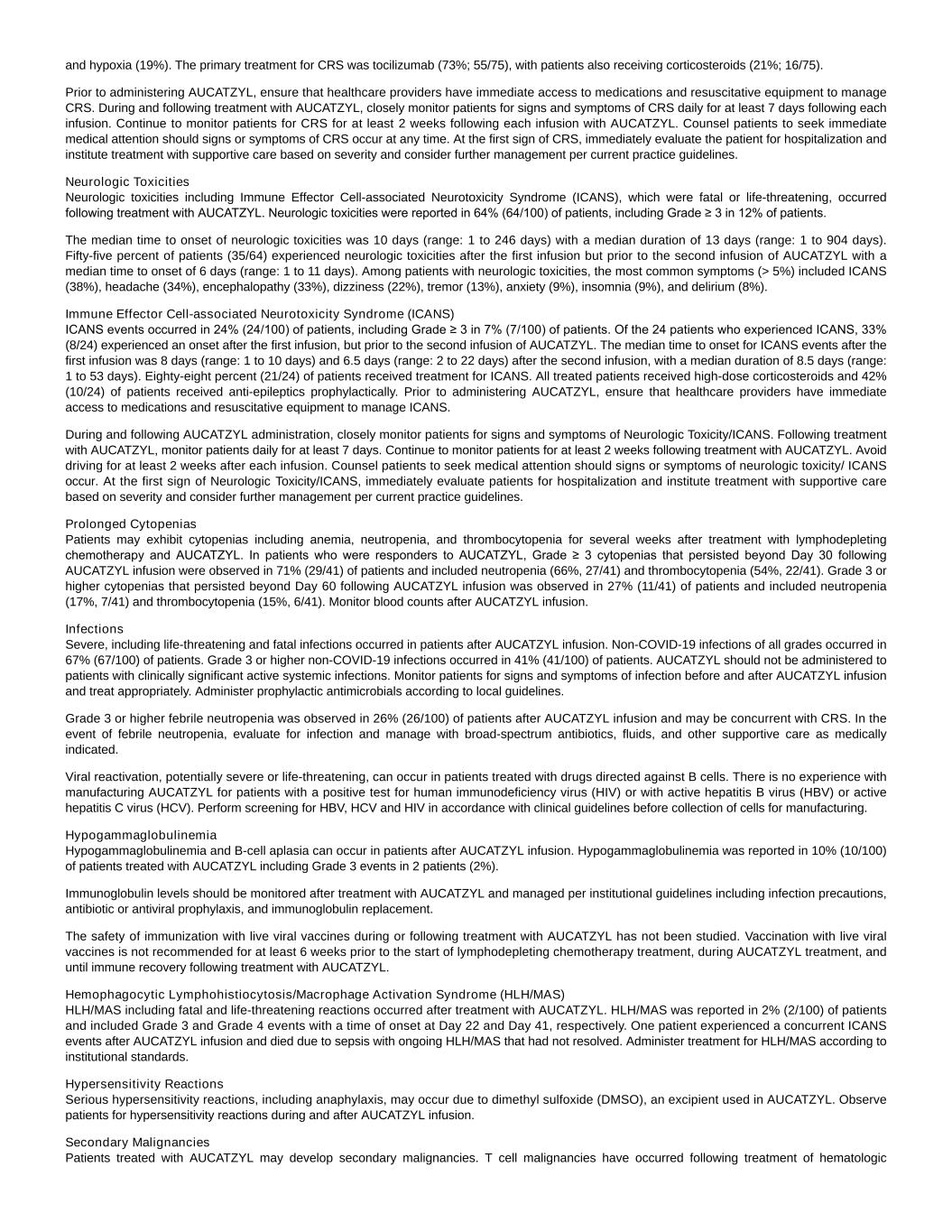 and hypoxia (19%). The primary treatment for CRS was tocilizumab (73%; 55/75), with patients also receiving corticosteroids (21%; 16/75). Prior to administering AUCATZYL, ensure that healthcare providers have immediate access to medications and resuscitative equipment to manage CRS. During and following treatment with AUCATZYL, closely monitor patients for signs and symptoms of CRS daily for at least 7 days following each infusion. Continue to monitor patients for CRS for at least 2 weeks following each infusion with AUCATZYL. Counsel patients to seek immediate medical attention should signs or symptoms of CRS occur at any time. At the first sign of CRS, immediately evaluate the patient for hospitalization and institute treatment with supportive care based on severity and consider further management per current practice guidelines.  Neurologic Toxicities Neurologic toxicities including Immune Effector Cell-associated Neurotoxicity Syndrome (ICANS), which were fatal or life-threatening, occurred following treatment with AUCATZYL. Neurologic toxicities were reported in 64% (64/100) of patients, including Grade ≥ 3 in 12% of patients. The median time to onset of neurologic toxicities was 10 days (range: 1 to 246 days) with a median duration of 13 days (range: 1 to 904 days). Fifty-five percent of patients (35/64) experienced neurologic toxicities after the first infusion but prior to the second infusion of AUCATZYL with a median time to onset of 6 days (range: 1 to 11 days). Among patients with neurologic toxicities, the most common symptoms (> 5%) included ICANS (38%), headache (34%), encephalopathy (33%), dizziness (22%), tremor (13%), anxiety (9%), insomnia (9%), and delirium (8%).  Immune Effector Cell-associated Neurotoxicity Syndrome (ICANS)  ICANS events occurred in 24% (24/100) of patients, including Grade ≥ 3 in 7% (7/100) of patients. Of the 24 patients who experienced ICANS, 33% (8/24) experienced an onset after the first infusion, but prior to the second infusion of AUCATZYL. The median time to onset for ICANS events after the first infusion was 8 days (range: 1 to 10 days) and 6.5 days (range: 2 to 22 days) after the second infusion, with a median duration of 8.5 days (range: 1 to 53 days). Eighty-eight percent (21/24) of patients received treatment for ICANS. All treated patients received high-dose corticosteroids and 42% (10/24) of patients received anti-epileptics prophylactically. Prior to administering AUCATZYL, ensure that healthcare providers have immediate access to medications and resuscitative equipment to manage ICANS. During and following AUCATZYL administration, closely monitor patients for signs and symptoms of Neurologic Toxicity/ICANS. Following treatment with AUCATZYL, monitor patients daily for at least 7 days. Continue to monitor patients for at least 2 weeks following treatment with AUCATZYL. Avoid driving for at least 2 weeks after each infusion. Counsel patients to seek medical attention should signs or symptoms of neurologic toxicity/ ICANS occur. At the first sign of Neurologic Toxicity/ICANS, immediately evaluate patients for hospitalization and institute treatment with supportive care based on severity and consider further management per current practice guidelines.  Prolonged Cytopenias Patients may exhibit cytopenias including anemia, neutropenia, and thrombocytopenia for several weeks after treatment with lymphodepleting chemotherapy and AUCATZYL. In patients who were responders to AUCATZYL, Grade ≥ 3 cytopenias that persisted beyond Day 30 following AUCATZYL infusion were observed in 71% (29/41) of patients and included neutropenia (66%, 27/41) and thrombocytopenia (54%, 22/41). Grade 3 or higher cytopenias that persisted beyond Day 60 following AUCATZYL infusion was observed in 27% (11/41) of patients and included neutropenia (17%, 7/41) and thrombocytopenia (15%, 6/41). Monitor blood counts after AUCATZYL infusion.  Infections Severe, including life-threatening and fatal infections occurred in patients after AUCATZYL infusion. Non-COVID-19 infections of all grades occurred in 67% (67/100) of patients. Grade 3 or higher non-COVID-19 infections occurred in 41% (41/100) of patients. AUCATZYL should not be administered to patients with clinically significant active systemic infections. Monitor patients for signs and symptoms of infection before and after AUCATZYL infusion and treat appropriately. Administer prophylactic antimicrobials according to local guidelines.  Grade 3 or higher febrile neutropenia was observed in 26% (26/100) of patients after AUCATZYL infusion and may be concurrent with CRS. In the event of febrile neutropenia, evaluate for infection and manage with broad-spectrum antibiotics, fluids, and other supportive care as medically indicated.  Viral reactivation, potentially severe or life-threatening, can occur in patients treated with drugs directed against B cells. There is no experience with manufacturing AUCATZYL for patients with a positive test for human immunodeficiency virus (HIV) or with active hepatitis B virus (HBV) or active hepatitis C virus (HCV). Perform screening for HBV, HCV and HIV in accordance with clinical guidelines before collection of cells for manufacturing.  Hypogammaglobulinemia Hypogammaglobulinemia and B-cell aplasia can occur in patients after AUCATZYL infusion. Hypogammaglobulinemia was reported in 10% (10/100) of patients treated with AUCATZYL including Grade 3 events in 2 patients (2%). Immunoglobulin levels should be monitored after treatment with AUCATZYL and managed per institutional guidelines including infection precautions, antibiotic or antiviral prophylaxis, and immunoglobulin replacement. The safety of immunization with live viral vaccines during or following treatment with AUCATZYL has not been studied. Vaccination with live viral vaccines is not recommended for at least 6 weeks prior to the start of lymphodepleting chemotherapy treatment, during AUCATZYL treatment, and until im