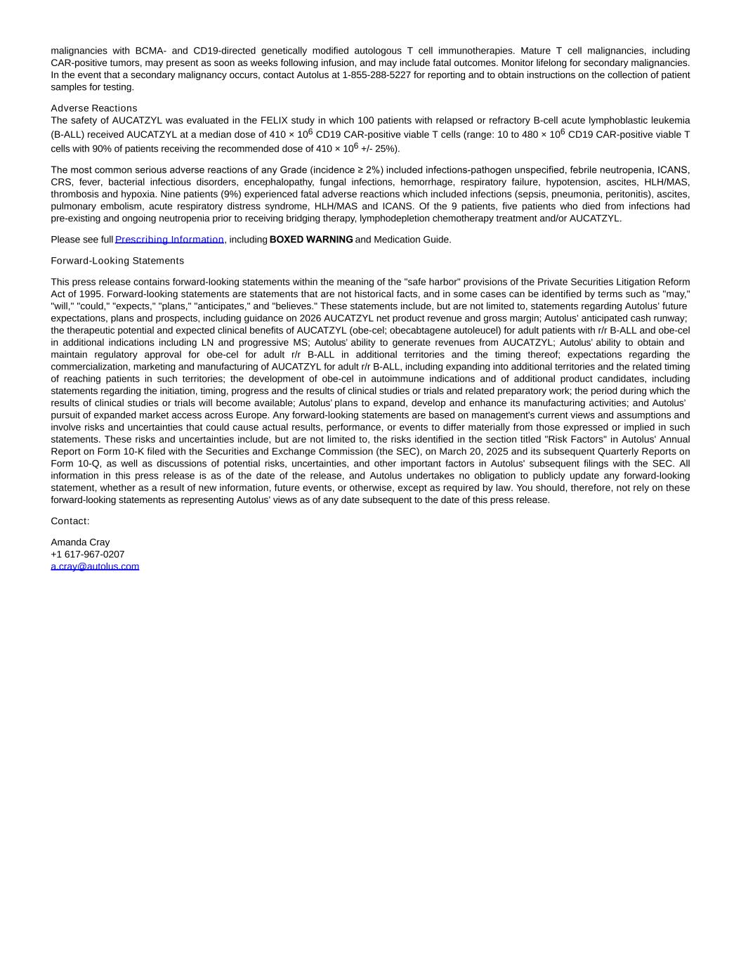 malignancies with BCMA- and CD19-directed genetically modified autologous T cell immunotherapies. Mature T cell malignancies, including CAR-positive tumors, may present as soon as weeks following infusion, and may include fatal outcomes. Monitor lifelong for secondary malignancies. In the event that a secondary malignancy occurs, contact Autolus at 1-855-288-5227 for reporting and to obtain instructions on the collection of patient samples for testing.  Adverse Reactions The safety of AUCATZYL was evaluated in the FELIX study in which 100 patients with relapsed or refractory B-cell acute lymphoblastic leukemia (B-ALL) received AUCATZYL at a median dose of 410 × 106 CD19 CAR-positive viable T cells (range: 10 to 480 × 106 CD19 CAR-positive viable T cells with 90% of patients receiving the recommended dose of 410 × 106 +/- 25%). The most common serious adverse reactions of any Grade (incidence ≥ 2%) included infections-pathogen unspecified, febrile neutropenia, ICANS, CRS, fever, bacterial infectious disorders, encephalopathy, fungal infections, hemorrhage, respiratory failure, hypotension, ascites, HLH/MAS, thrombosis and hypoxia. Nine patients (9%) experienced fatal adverse reactions which included infections (sepsis, pneumonia, peritonitis), ascites, pulmonary embolism, acute respiratory distress syndrome, HLH/MAS and ICANS. Of the 9 patients, five patients who died from infections had pre-existing and ongoing neutropenia prior to receiving bridging therapy, lymphodepletion chemotherapy treatment and/or AUCATZYL.  Please see full Prescribing Information, including BOXED WARNING and Medication Guide.  Forward-Looking Statements This press release contains forward-looking statements within the meaning of the "safe harbor" provisions of the Private Securities Litigation Reform Act of 1995. Forward-looking statements are statements that are not historical facts, and in some cases can be identified by terms such as "may," "will," "could," "expects," "plans," "anticipates," and "believes." These statements include, but are not limited to, statements regarding Autolus’ future expectations, plans and prospects, including guidance on 2026 AUCATZYL net product revenue and gross margin; Autolus’ anticipated cash runway; the therapeutic potential and expected clinical benefits of AUCATZYL (obe-cel; obecabtagene autoleucel) for adult patients with r/r B-ALL and obe-cel in additional indications including LN and progressive MS; Autolus’ ability to generate revenues from AUCATZYL; Autolus’ ability to obtain and maintain regulatory approval for obe-cel for adult r/r B-ALL in additional territories and the timing thereof; expectations regarding the commercialization, marketing and manufacturing of AUCATZYL for adult r/r B-ALL, including expanding into additional territories and the related timing of reaching patients in such territories; the development of obe-cel in autoimmune indications and of additional product candidates, including statements regarding the initiation, timing, progress and the results of clinical studies or trials and related preparatory work; the period during which the results of clinical studies or trials will become available; Autolus’ plans to expand, develop and enhance its manufacturing activities; and Autolus’ pursuit of expanded market access across Europe. Any forward-looking statements are based on management's current views and assumptions and involve risks and uncertainties that could cause actual results, performance, or events to differ materially from those expressed or implied in such statements. These risks and uncertainties include, but are not limited to, the risks identified in the section titled "Risk Factors" in Autolus' Annual Report on Form 10-K filed with the Securities and Exchange Commission (the SEC), on March 20, 2025 and its subsequent Quarterly Reports on Form 10-Q, as well as discussions of potential risks, uncertainties, and other important factors in Autolus' subsequent filings with the SEC. All information in this press release is as of the date of the release, and Autolus undertakes no obligation to publicly update any forward-looking statement, whether as a result of new information, future events, or otherwise, except as required by law. You should, therefore, not rely on these forward-looking statements as representing Autolus’ views as of any date subsequent to the date of this press release. Contact: Amanda Cray  +1 617-967-0207  a.cray@autolus.com
