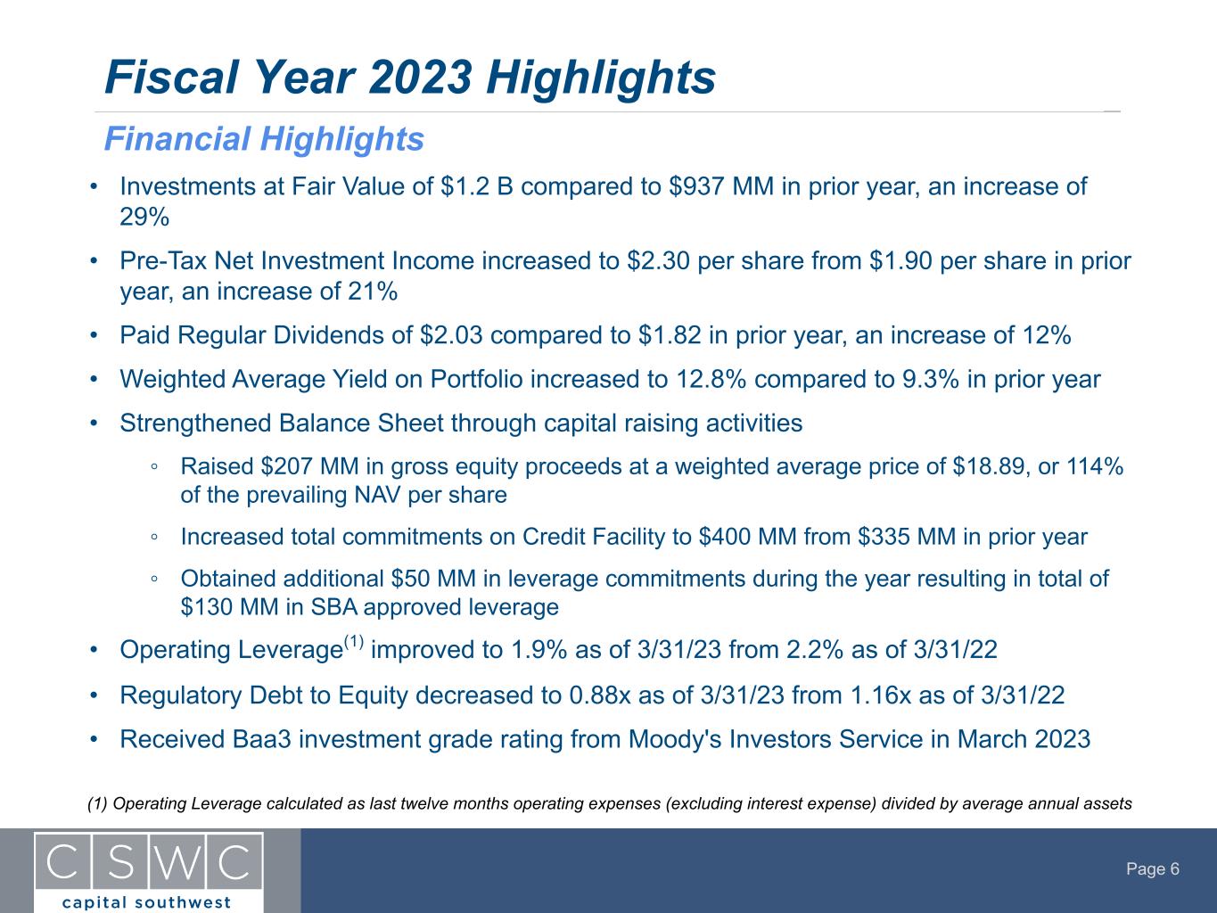 Page 6 Fiscal Year 2023 Highlights Financial Highlights (1) Operating Leverage calculated as last twelve months operating expenses (excluding interest expense) divided by average annual assets • Investments at Fair Value of $1.2 B compared to $937 MM in prior year, an increase of 29% • Pre-Tax Net Investment Income increased to $2.30 per share from $1.90 per share in prior year, an increase of 21% • Paid Regular Dividends of $2.03 compared to $1.82 in prior year, an increase of 12% • Weighted Average Yield on Portfolio increased to 12.8% compared to 9.3% in prior year • Strengthened Balance Sheet through capital raising activities ◦ Raised $207 MM in gross equity proceeds at a weighted average price of $18.89, or 114% of the prevailing NAV per share ◦ Increased total commitments on Credit Facility to $400 MM from $335 MM in prior year ◦ Obtained additional $50 MM in leverage commitments during the year resulting in total of $130 MM in SBA approved leverage • Operating Leverage(1) improved to 1.9% as of 3/31/23 from 2.2% as of 3/31/22 • Regulatory Debt to Equity decreased to 0.88x as of 3/31/23 from 1.16x as of 3/31/22 • Received Baa3 investment grade rating from Moody's Investors Service in March 2023