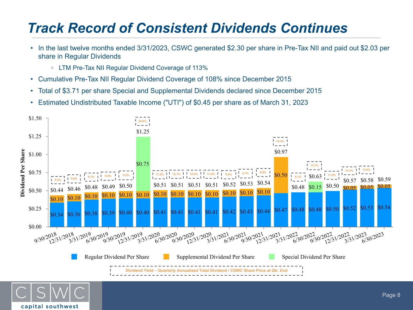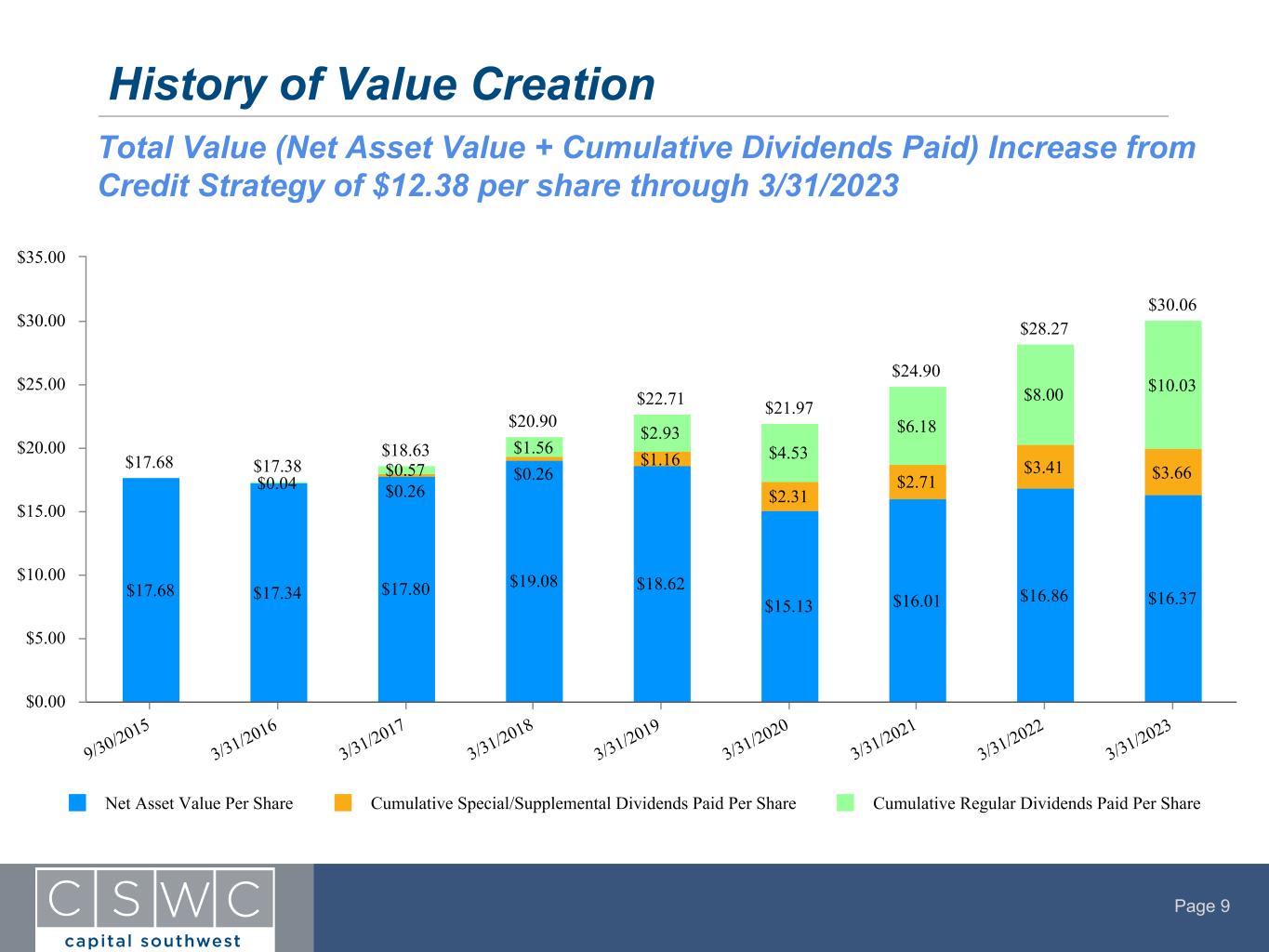 Page 8 • In the last twelve months ended 3/31/2023, CSWC generated $2.30 per share in Pre-Tax NII and paid out $2.03 per share in Regular Dividends ◦ LTM Pre-Tax NII Regular Dividend Coverage of 113% • Cumulative Pre-Tax NII Regular Dividend Coverage of 108% since December 2015 • Total of $3.71 per share Special and Supplemental Dividends declared since December 2015 • Estimated Undistributed Taxable Income ("UTI") of $0.45 per share as of March 31, 2023 Track Record of Consistent Dividends Continues Dividend Yield – Quarterly Annualized Total Dividend / CSWC Share Price at Qtr. End D iv id en d Pe r Sh ar e $0.48 $0.50 $0.44 $0.46 $0.48 $0.49 $0.50 $0.51 $0.51 $0.51 $0.51 $0.52 $0.53 $0.54 $0.97 $0.57 $0.58 $0.59 $1.25 $0.63 $0.34 $0.36 $0.38 $0.39 $0.40 $0.40 $0.41 $0.41 $0.41 $0.41 $0.42 $0.43 $0.44 $0.47 $0.48 $0.48 $0.50 $0.52 $0.53 $0.54 $0.10 $0.10 $0.10 $0.10 $0.10 $0.10 $0.10 $0.10 $0.10 $0.10 $0.10 $0.10 $0.10 $0.50 $0.05 $0.05 $0.05 $0.75 $0.15 Regular Dividend Per Share Supplemental Dividend Per Share Special Dividend Per Share 9/30/2018 12/31/2018 3/31/2019 6/30/2019 9/30/2019 12/31/2019 3/31/2020 6/30/2020 9/30/2020 12/31/2020 3/31/2021 6/30/2021 9/30/2021 12/31/2021 3/31/2022 6/30/2022 9/30/2022 12/31/2022 3/31/2023 6/30/2023 $0.00 $0.25 $0.50 $0.75 $1.00 $1.25 $1.50 9.3% 9.6% 9.1% 9.4% 9.2% 24.0% 17.9% 15.1% 14.5% 11.5% 9.4% 9.1% 8.6% 15.3% 8.1% 13.7% 13.3% 13.0% 11.8%
