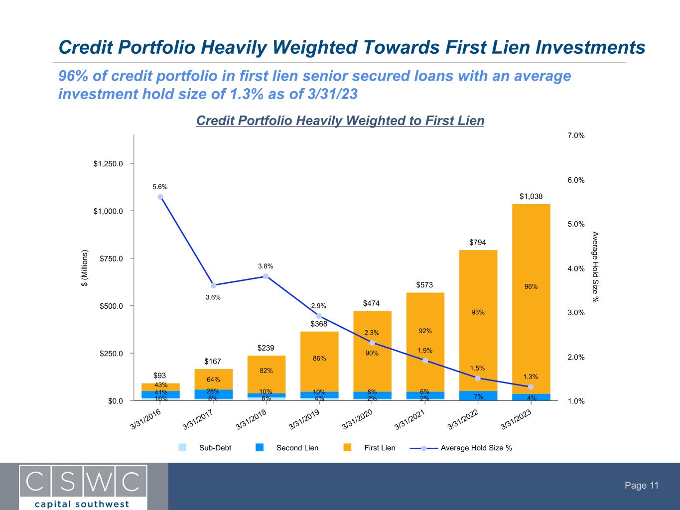 Page 10 CORE: Lower Middle Market (“LMM”): CSWC led or Club Deals ◦ Companies with EBITDA between $3 MM and $20 MM ◦ Typical leverage of 2.0x – 4.0x Debt to EBITDA through CSWC debt position ◦ Commitment size up to $35 MM with hold sizes generally $5 MM to $35 MM ◦ Both sponsored and non-sponsored deals ◦ Securities include first lien, unitranche, and second lien ◦ Frequently make equity co-investments alongside CSWC debt OPPORTUNISTIC: Upper Middle Market (“UMM”): Syndicated or Club, First and Second Lien ▪ Companies typically have in excess of $20 MM in EBITDA ▪ Typical leverage of 3.5x – 5.5x Debt to EBITDA through CSWC debt position ▪ Hold sizes generally $5 MM to $20 MM ▪ Floating rate first and second lien debt securities Credit Investment Strategy
