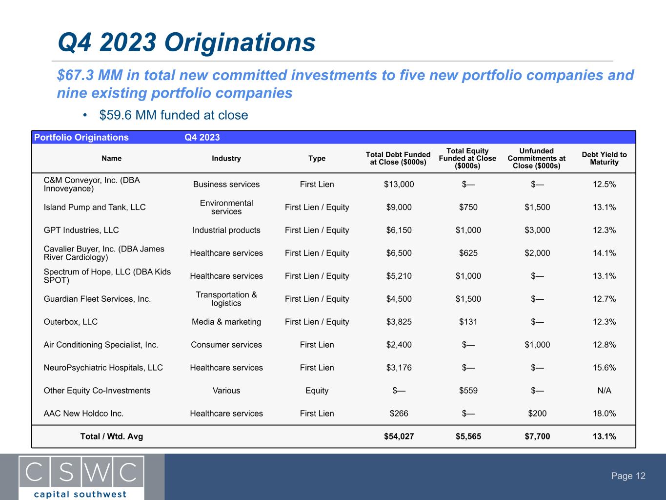 Page 12 $67.3 MM in total new committed investments to five new portfolio companies and nine existing portfolio companies Q4 2023 Originations Portfolio Originations Q4 2023 Name Industry Type Total Debt Funded at Close ($000s) Total Equity Funded at Close ($000s) Unfunded Commitments at Close ($000s) Debt Yield to Maturity C&M Conveyor, Inc. (DBA Innoveyance) Business services First Lien $13,000 $— $— 12.5% Island Pump and Tank, LLC Environmental services First Lien / Equity $9,000 $750 $1,500 13.1% GPT Industries, LLC Industrial products First Lien / Equity $6,150 $1,000 $3,000 12.3% Cavalier Buyer, Inc. (DBA James River Cardiology) Healthcare services First Lien / Equity $6,500 $625 $2,000 14.1% Spectrum of Hope, LLC (DBA Kids SPOT) Healthcare services First Lien / Equity $5,210 $1,000 $— 13.1% Guardian Fleet Services, Inc. Transportation & logistics First Lien / Equity $4,500 $1,500 $— 12.7% Outerbox, LLC Media & marketing First Lien / Equity $3,825 $131 $— 12.3% Air Conditioning Specialist, Inc. Consumer services First Lien $2,400 $— $1,000 12.8% NeuroPsychiatric Hospitals, LLC Healthcare services First Lien $3,176 $— $— 15.6% Other Equity Co-Investments Various Equity $— $559 $— N/A AAC New Holdco Inc. Healthcare services First Lien $266 $— $200 18.0% Total / Wtd. Avg $54,027 $5,565 $7,700 13.1% • $59.6 MM funded at close