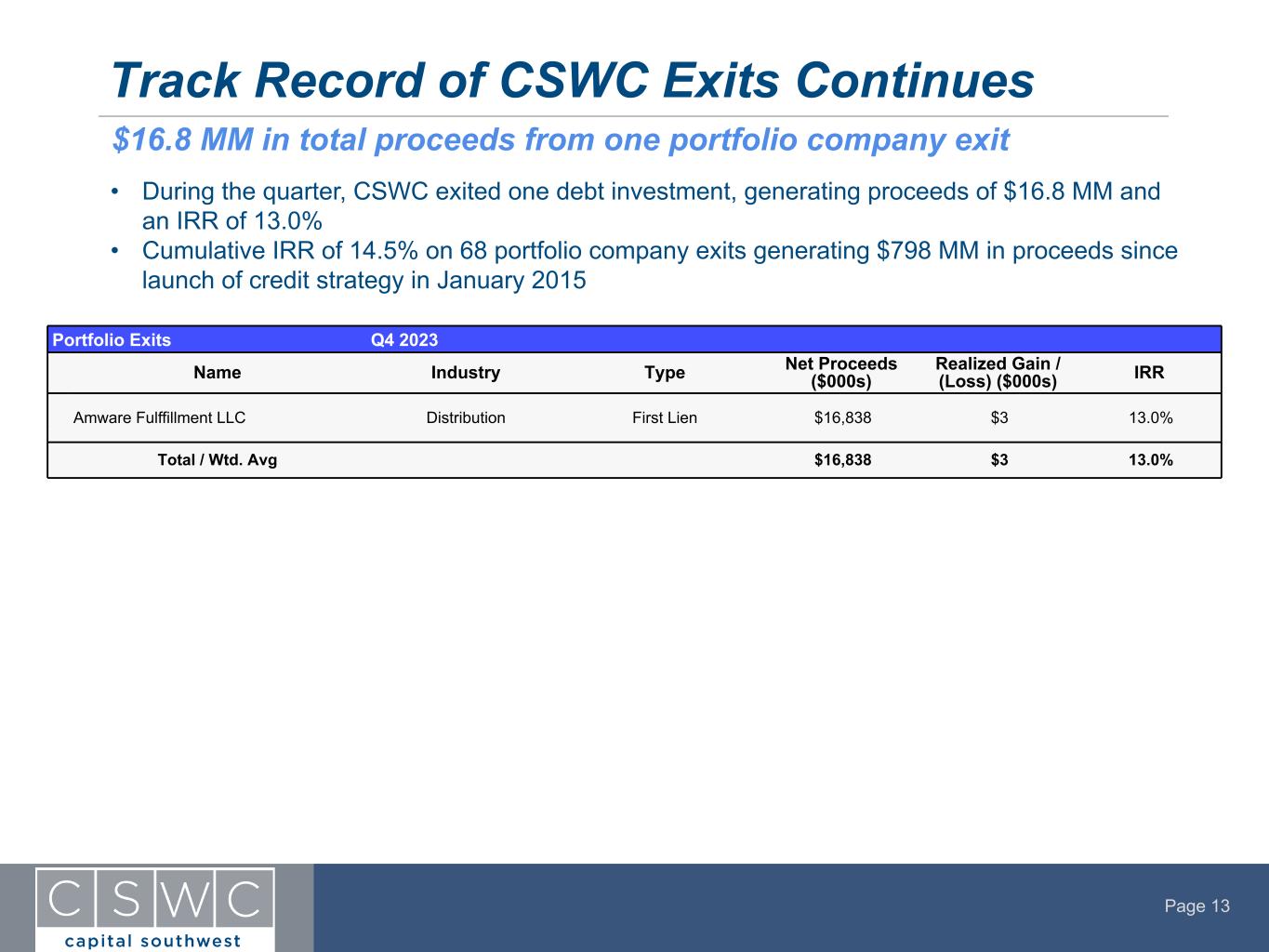 Page 13 Portfolio Exits Q4 2023 Name Industry Type Net Proceeds ($000s) Realized Gain / (Loss) ($000s) IRR Amware Fulffillment LLC Distribution First Lien $16,838 $3 13.0% Total / Wtd. Avg $16,838 $3 13.0% Track Record of CSWC Exits Continues • During the quarter, CSWC exited one debt investment, generating proceeds of $16.8 MM and an IRR of 13.0% • Cumulative IRR of 14.5% on 68 portfolio company exits generating $798 MM in proceeds since launch of credit strategy in January 2015 $16.8 MM in total proceeds from one portfolio company exit