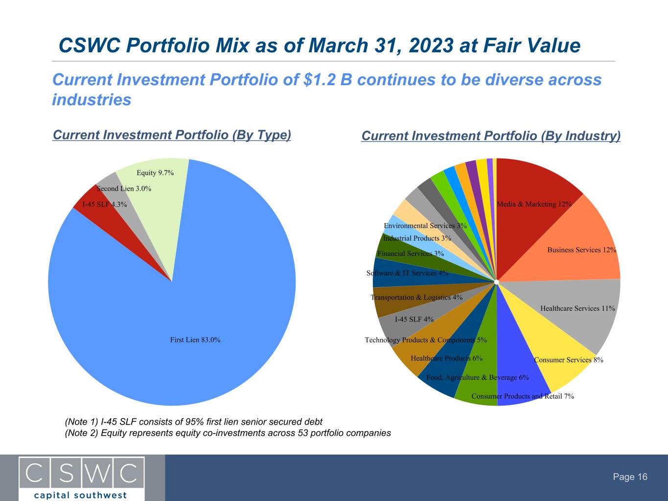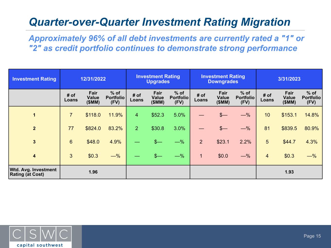 Page 14 CSWC Investment Portfolio Composition Note: All metrics above exclude the I-45 SLF (1) At March 31, 2023 and December 31, 2022, we had equity ownership in approximately 62% and 59%, respectively, of our investments (2) The weighted-average annual effective yields were computed using the effective interest rates during the quarter for all debt investments at cost as of March 31, 2023, including accretion of original issue discount but excluding fees payable upon repayment of the debt instruments (3) The weighted average annual effective yields on total investments were calculated by dividing total investment income, exclusive of non-recurring fees, by average total investments at fair value (4) Includes CSWC debt investments only. Weighted average EBITDA metric is calculated using investment cost basis weighting. For both quarters ended March 31, 2023 and December 31, 2022, nine portfolio companies are excluded from this calculation due to a reported debt to adjusted EBITDA ratio that was not meaningful (5) Includes CSWC debt investments only. Calculated as the amount of each portfolio company’s debt (including CSWC’s position and debt senior or pari passu to CSWC’s position, but excluding debt subordinated to CSWC’s position) in the capital structure divided by each portfolio company’s adjusted EBITDA. Weighted average leverage is calculated using investment cost basis weighting. For both quarters ended March 31, 2023 and December 31, 2022, nine portfolio companies are excluded from this calculation due to a reported debt to adjusted EBITDA ratio that was not meaningful Maintaining appropriate portfolio leverage while receiving attractive risk-adjusted returns Investment Portfolio - Statistics (in $000's) 12/31/2022 3/31/2023 Total CSWC Portfolio Total CSWC Portfolio Number of Portfolio Companies 81 85 Total Cost $1,083,712 $1,139,352 Total Fair Value $1,102,421 $1,155,132 Average Hold Size Debt Investments (at Fair Value) $13,382 $13,303 Average Hold Size Equity Investments (at Fair Value) $2,336 $2,218 % First Lien Investments (at Fair Value) 86.5% 86.6% % Second Lien Investments (at Fair Value) 3.2% 3.1% % Subordinated Debt Investments (at Fair Value) 0.1% 0.1% % Equity (at Fair Value) (1) 10.2% 10.2% Wtd. Avg. Yield on Debt Investments (2) 12.0% 12.8% Wtd. Avg. Yield on Total Investments (3) 11.7% 12.1% Wtd. Avg. EBITDA of Issuer ($MM's) (4) $22.1 $21.0 Wtd. Avg. Leverage through CSWC Security (5) 3.6x 4.0x
