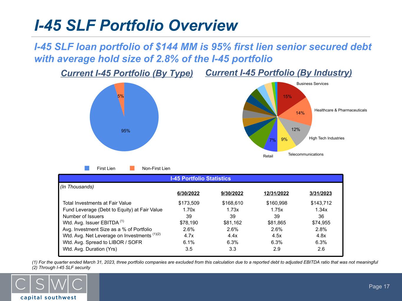 Page 16 CSWC Portfolio Mix as of March 31, 2023 at Fair Value Current Investment Portfolio (By Type) Current Investment Portfolio (By Industry) Current Investment Portfolio of $1.2 B continues to be diverse across industries First Lien 83.0% I-45 SLF 4.3% Second Lien 3.0% Equity 9.7% Media & Marketing 12% Business Services 12% Healthcare Services 11% Consumer Services 8% Consumer Products and Retail 7% Food, Agriculture & Beverage 6% Healthcare Products 6% Technology Products & Components 5% I-45 SLF 4% Transportation & Logistics 4% Software & IT Services 4% Financial Services 3% Industrial Products 3% Environmental Services 3% (Note 1) I-45 SLF consists of 95% first lien senior secured debt (Note 2) Equity represents equity co-investments across 53 portfolio companies