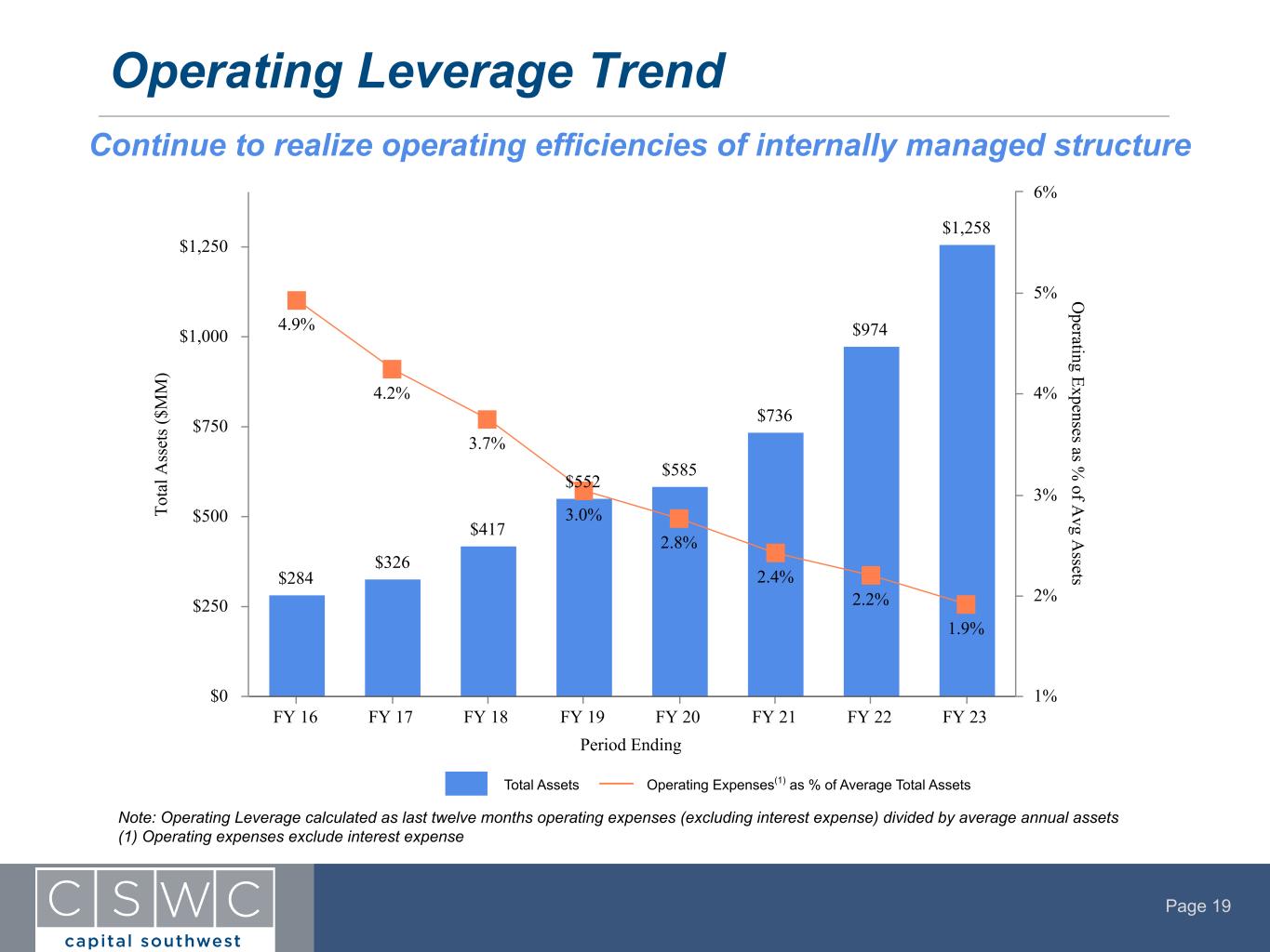 Page 19 Operating Leverage Trend Continue to realize operating efficiencies of internally managed structure Period Ending To ta l A ss et s ( $M M ) O perating Expenses as % of A vg A ssets$284 $326 $417 $552 $585 $736 $974 $1,258 4.9% 4.2% 3.7% 3.0% 2.8% 2.4% 2.2% 1.9% FY 16 FY 17 FY 18 FY 19 FY 20 FY 21 FY 22 FY 23 $0 $250 $500 $750 $1,000 $1,250 1% 2% 3% 4% 5% 6% Total Assets Operating Expenses(1) as % of Average Total Assets Note: Operating Leverage calculated as last twelve months operating expenses (excluding interest expense) divided by average annual assets (1) Operating expenses exclude interest expense