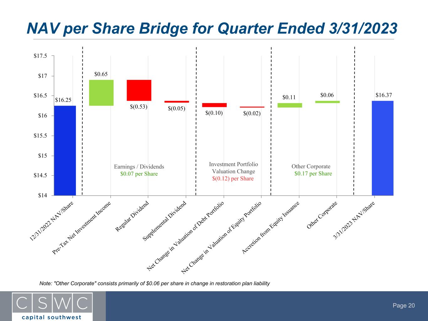 Page 20 $16.25 $0.65 $(0.53) $(0.05) $(0.10) $(0.02) $0.11 $0.06 $16.37 12 /31 /20 22 NAV/Shar e Pre- Tax Net I nv est ment In com e Regu lar Divi den d Sup ple ment al D ivi den d Net C han ge in Valu ati on of Debt Port fol io Net C han ge in Valu ati on of Equ ity Port fol io Accr eti on fro m Equ ity Iss uan ce Othe r C orp ora te 3/3 1/2 02 3 N AV/Shar e $14 $14.5 $15 $15.5 $16 $16.5 $17 $17.5 NAV per Share Bridge for Quarter Ended 3/31/2023 Earnings / Dividends $0.07 per Share Investment Portfolio Valuation Change $(0.12) per Share Other Corporate $0.17 per Share Note: "Other Corporate" consists primarily of $0.06 per share in change in restoration plan liability