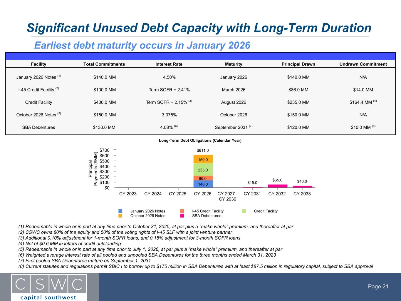 Page 21 Significant Unused Debt Capacity with Long-Term Duration Earliest debt maturity occurs in January 2026 Facility Total Commitments Interest Rate Maturity Principal Drawn Undrawn Commitment January 2026 Notes (1) $140.0 MM 4.50% January 2026 $140.0 MM N/A I-45 Credit Facility (2) $100.0 MM Term SOFR + 2.41% March 2026 $86.0 MM $14.0 MM Credit Facility $400.0 MM Term SOFR + 2.15% (3) August 2026 $235.0 MM $164.4 MM (4) October 2026 Notes (5) $150.0 MM 3.375% October 2026 $150.0 MM N/A SBA Debentures $130.0 MM 4.08% (6) September 2031 (7) $120.0 MM $10.0 MM (8) P rin ci pa l P ay m en ts ($ M M ) Long-Term Debt Obligations (Calendar Year) $611.0 $15.0 $65.0 $40.0 140.0 86.0 235.0 150.0 January 2026 Notes I-45 Credit Facility Credit Facility October 2026 Notes SBA Debentures CY 2023 CY 2024 CY 2025 CY 2026 CY 2027 - CY 2030 CY 2031 CY 2032 CY 2033 $0 $100 $200 $300 $400 $500 $600 $700 (1) Redeemable in whole or in part at any time prior to October 31, 2025, at par plus a "make whole" premium, and thereafter at par (2) CSWC owns 80% of the equity and 50% of the voting rights of I-45 SLF with a joint venture partner (3) Additional 0.10% adjustment for 1-month SOFR loans, and 0.15% adjustment for 3-month SOFR loans (4) Net of $0.6 MM in letters of credit outstanding (5) Redeemable in whole or in part at any time prior to July 1, 2026, at par plus a "make whole" premium, and thereafter at par (6) Weighted average interest rate of all pooled and unpooled SBA Debentures for the three months ended March 31, 2023 (7) First pooled SBA Debentures mature on September 1, 2031 (8) Current statutes and regulations permit SBIC I to borrow up to $175 million in SBA Debentures with at least $87.5 million in regulatory capital, subject to SBA approval