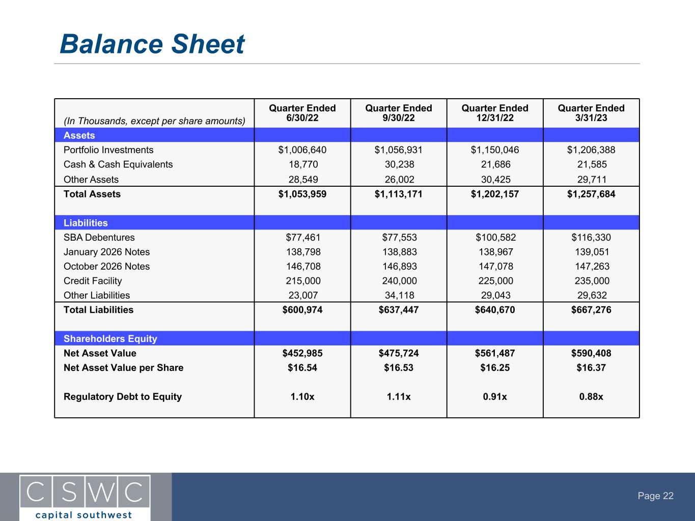 Page 22 Balance Sheet (In Thousands, except per share amounts) Quarter Ended 6/30/22 Quarter Ended 9/30/22 Quarter Ended 12/31/22 Quarter Ended 3/31/23 Assets Portfolio Investments $1,006,640 $1,056,931 $1,150,046 $1,206,388 Cash & Cash Equivalents 18,770 30,238 21,686 21,585 Other Assets 28,549 26,002 30,425 29,711 Total Assets $1,053,959 $1,113,171 $1,202,157 $1,257,684 Liabilities SBA Debentures $77,461 $77,553 $100,582 $116,330 January 2026 Notes 138,798 138,883 138,967 139,051 October 2026 Notes 146,708 146,893 147,078 147,263 Credit Facility 215,000 240,000 225,000 235,000 Other Liabilities 23,007 34,118 29,043 29,632 Total Liabilities $600,974 $637,447 $640,670 $667,276 Shareholders Equity Net Asset Value $452,985 $475,724 $561,487 $590,408 Net Asset Value per Share $16.54 $16.53 $16.25 $16.37 Regulatory Debt to Equity 1.10x 1.11x 0.91x 0.88x