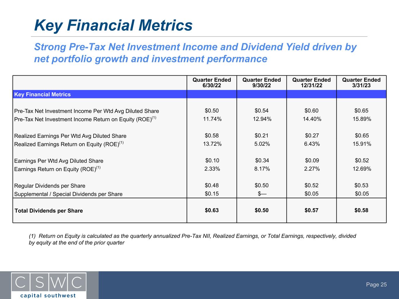 Page 25 Key Financial Metrics Strong Pre-Tax Net Investment Income and Dividend Yield driven by net portfolio growth and investment performance (1) Return on Equity is calculated as the quarterly annualized Pre-Tax NII, Realized Earnings, or Total Earnings, respectively, divided by equity at the end of the prior quarter Quarter Ended 6/30/22 Quarter Ended 9/30/22 Quarter Ended 12/31/22 Quarter Ended 3/31/23 Key Financial Metrics Pre-Tax Net Investment Income Per Wtd Avg Diluted Share $0.50 $0.54 $0.60 $0.65 Pre-Tax Net Investment Income Return on Equity (ROE)(1) 11.74% 12.94% 14.40% 15.89% Realized Earnings Per Wtd Avg Diluted Share $0.58 $0.21 $0.27 $0.65 Realized Earnings Return on Equity (ROE)(1) 13.72% 5.02% 6.43% 15.91% Earnings Per Wtd Avg Diluted Share $0.10 $0.34 $0.09 $0.52 Earnings Return on Equity (ROE)(1) 2.33% 8.17% 2.27% 12.69% Regular Dividends per Share $0.48 $0.50 $0.52 $0.53 Supplemental / Special Dividends per Share $0.15 $— $0.05 $0.05 Total Dividends per Share $0.63 $0.50 $0.57 $0.58