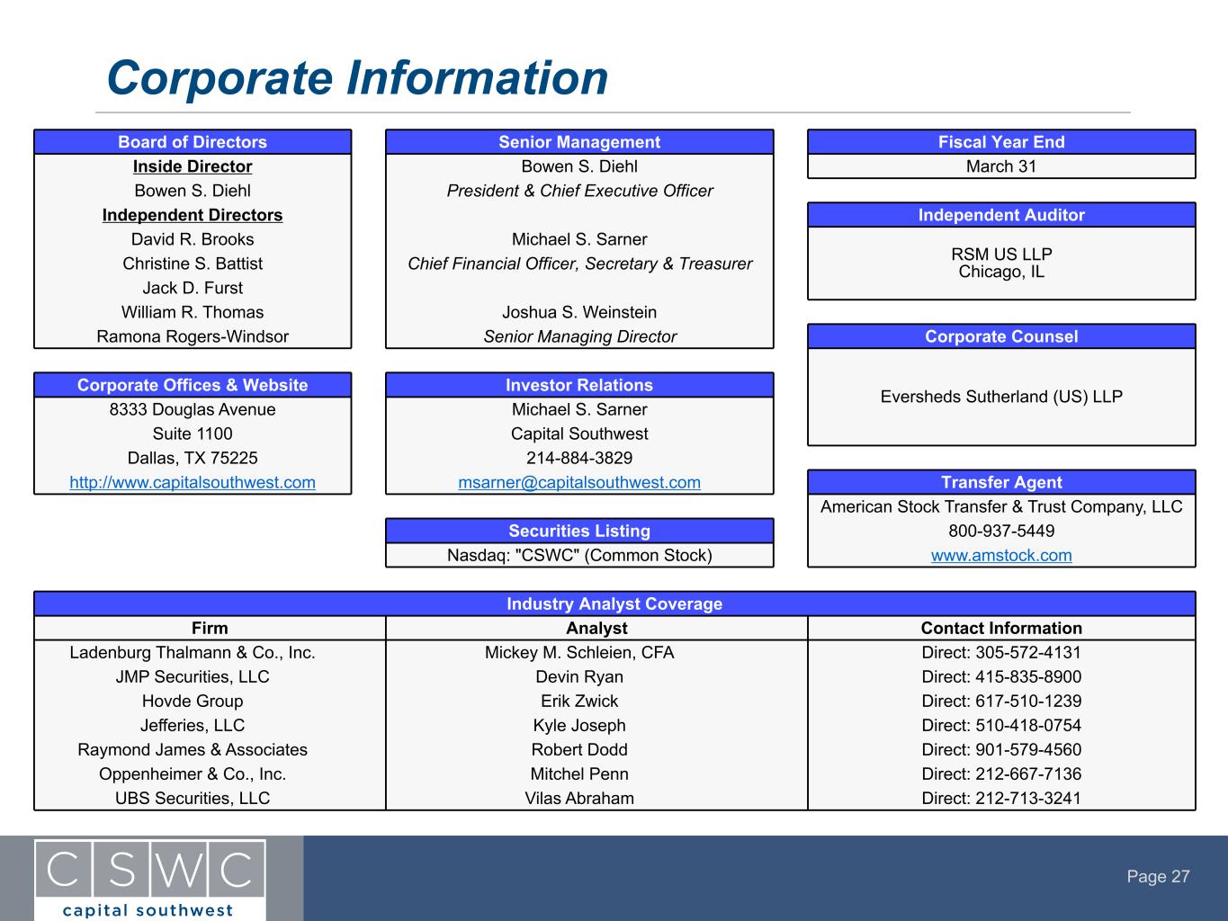 Page 27 Corporate Information Board of Directors Senior Management Fiscal Year End Inside Director Bowen S. Diehl March 31 Bowen S. Diehl President & Chief Executive Officer Independent Directors Independent Auditor David R. Brooks Michael S. Sarner RSM US LLP Chicago, ILChristine S. Battist Chief Financial Officer, Secretary & Treasurer Jack D. Furst William R. Thomas Joshua S. Weinstein Ramona Rogers-Windsor Senior Managing Director Corporate Counsel Eversheds Sutherland (US) LLP Corporate Offices & Website Investor Relations 8333 Douglas Avenue Michael S. Sarner Suite 1100 Capital Southwest Dallas, TX 75225 214-884-3829 http://www.capitalsouthwest.com msarner@capitalsouthwest.com Transfer Agent American Stock Transfer & Trust Company, LLC Securities Listing 800-937-5449 Nasdaq: "CSWC" (Common Stock) www.amstock.com Industry Analyst Coverage Firm Analyst Contact Information Ladenburg Thalmann & Co., Inc. Mickey M. Schleien, CFA Direct: 305-572-4131 JMP Securities, LLC Devin Ryan Direct: 415-835-8900 Hovde Group Erik Zwick Direct: 617-510-1239 Jefferies, LLC Kyle Joseph Direct: 510-418-0754 Raymond James & Associates Robert Dodd Direct: 901-579-4560 Oppenheimer & Co., Inc. Mitchel Penn Direct: 212-667-7136 UBS Securities, LLC Vilas Abraham Direct: 212-713-3241
