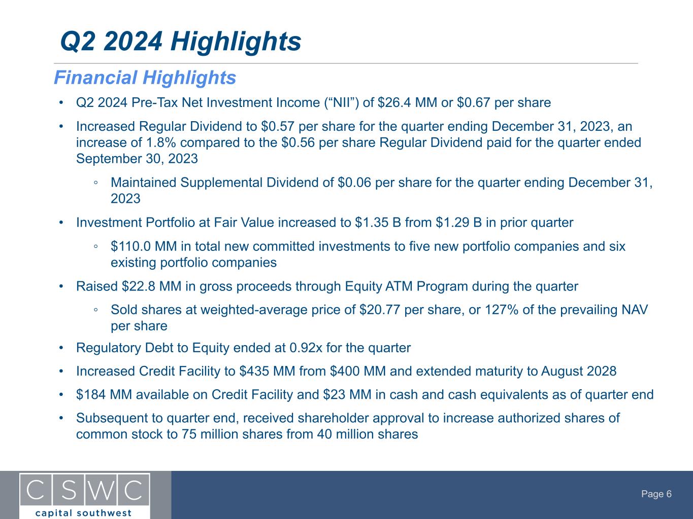 Q2 2024 Earnings Presentation 8333 Douglas Avenue, Suite 1100 | Dallas, Texas 75225 | 214.238.5700 | capitalsouthwest.com October 31, 2023 Capital Southwest Corporation