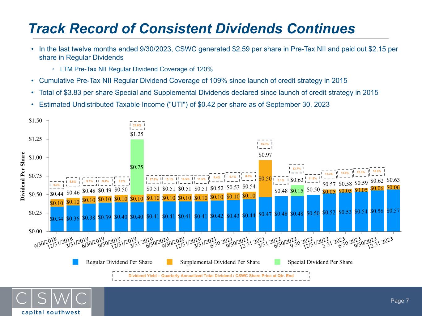 Page 6 • Q2 2024 Pre-Tax Net Investment Income (“NII”) of $26.4 MM or $0.67 per share • Increased Regular Dividend to $0.57 per share for the quarter ending December 31, 2023, an increase of 1.8% compared to the $0.56 per share Regular Dividend paid for the quarter ended September 30, 2023 ◦ Maintained Supplemental Dividend of $0.06 per share for the quarter ending December 31, 2023 • Investment Portfolio at Fair Value increased to $1.35 B from $1.29 B in prior quarter ◦ $110.0 MM in total new committed investments to five new portfolio companies and six existing portfolio companies • Raised $22.8 MM in gross proceeds through Equity ATM Program during the quarter ◦ Sold shares at weighted-average price of $20.77 per share, or 127% of the prevailing NAV per share • Regulatory Debt to Equity ended at 0.92x for the quarter • Increased Credit Facility to $435 MM from $400 MM and extended maturity to August 2028 • $184 MM available on Credit Facility and $23 MM in cash and cash equivalents as of quarter end • Subsequent to quarter end, received shareholder approval to increase authorized shares of common stock to 75 million shares from 40 million shares Q2 2024 Highlights Financial Highlights