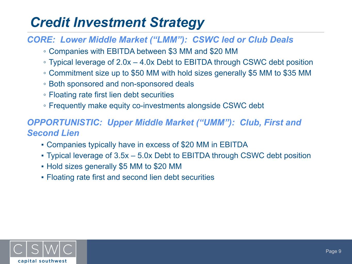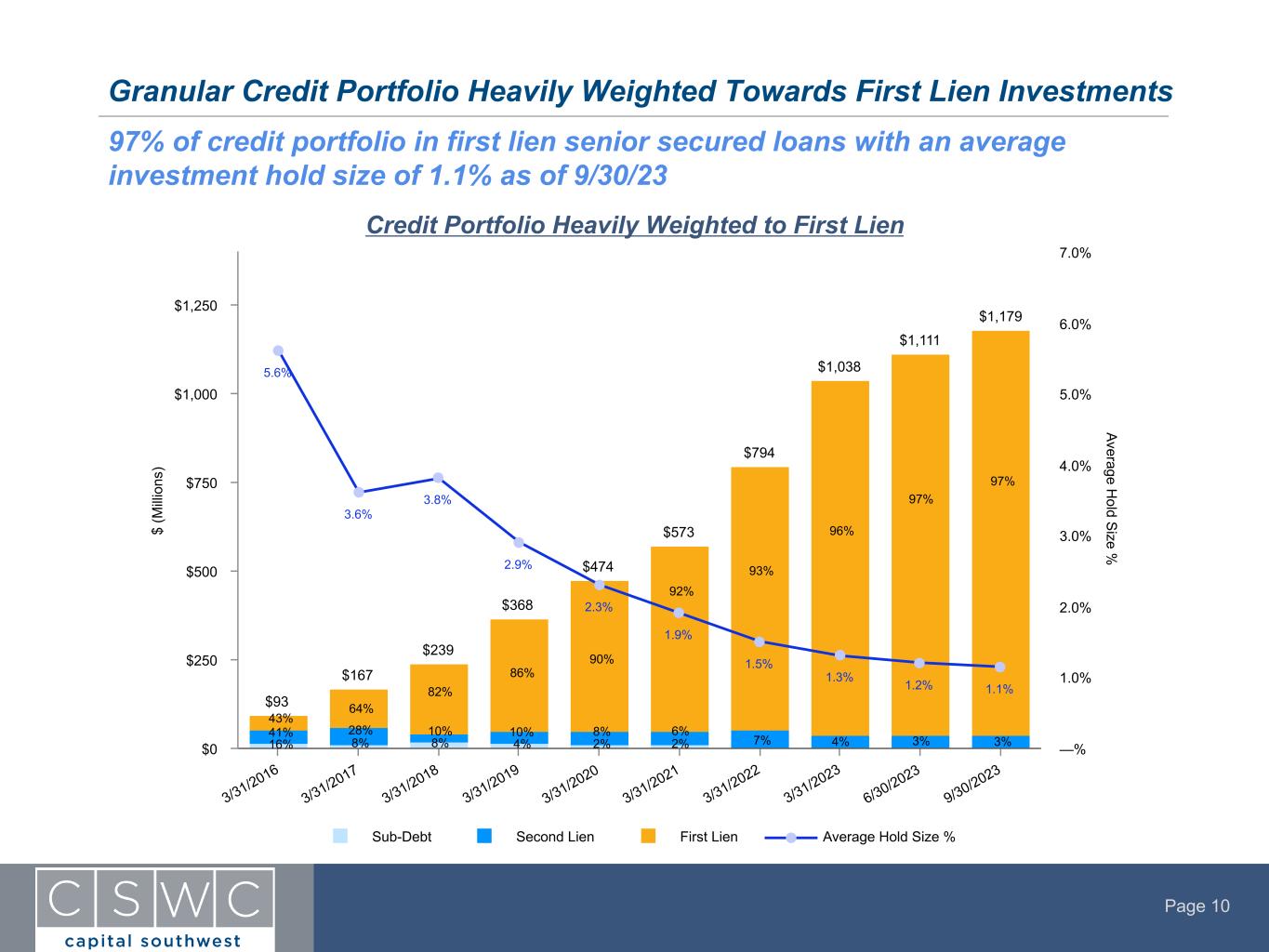 Page 9 CORE: Lower Middle Market (“LMM”): CSWC led or Club Deals ◦ Companies with EBITDA between $3 MM and $20 MM ◦ Typical leverage of 2.0x – 4.0x Debt to EBITDA through CSWC debt position ◦ Commitment size up to $50 MM with hold sizes generally $5 MM to $35 MM ◦ Both sponsored and non-sponsored deals ◦ Floating rate first lien debt securities ◦ Frequently make equity co-investments alongside CSWC debt OPPORTUNISTIC: Upper Middle Market (“UMM”): Club, First and Second Lien ▪ Companies typically have in excess of $20 MM in EBITDA ▪ Typical leverage of 3.5x – 5.0x Debt to EBITDA through CSWC debt position ▪ Hold sizes generally $5 MM to $20 MM ▪ Floating rate first and second lien debt securities Credit Investment Strategy