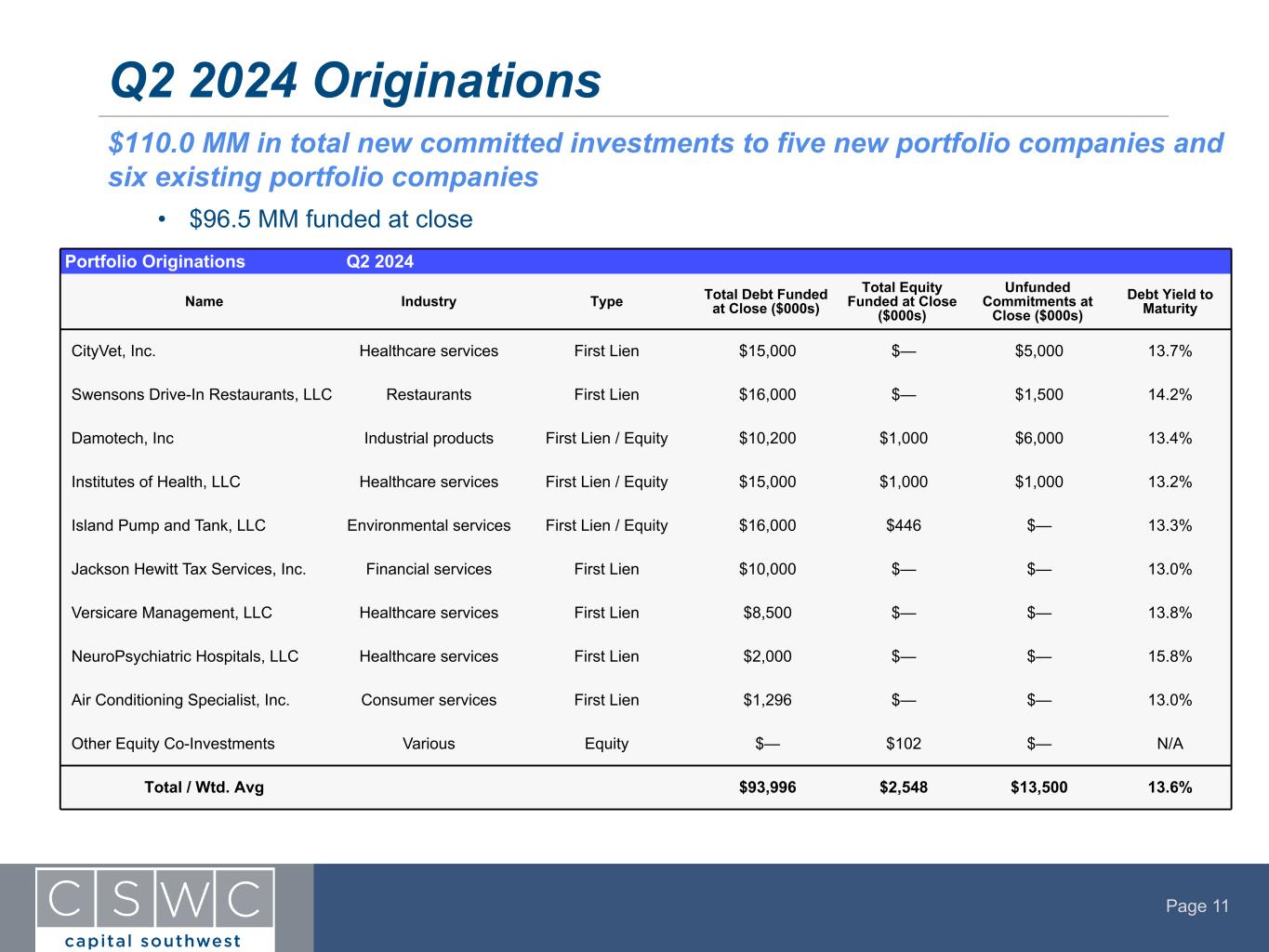 Page 11 $110.0 MM in total new committed investments to five new portfolio companies and six existing portfolio companies Q2 2024 Originations Portfolio Originations Q2 2024 Name Industry Type Total Debt Funded at Close ($000s) Total Equity Funded at Close ($000s) Unfunded Commitments at Close ($000s) Debt Yield to Maturity CityVet, Inc. Healthcare services First Lien $15,000 $— $5,000 13.7% Swensons Drive-In Restaurants, LLC Restaurants First Lien $16,000 $— $1,500 14.2% Damotech, Inc Industrial products First Lien / Equity $10,200 $1,000 $6,000 13.4% Institutes of Health, LLC Healthcare services First Lien / Equity $15,000 $1,000 $1,000 13.2% Island Pump and Tank, LLC Environmental services First Lien / Equity $16,000 $446 $— 13.3% Jackson Hewitt Tax Services, Inc. Financial services First Lien $10,000 $— $— 13.0% Versicare Management, LLC Healthcare services First Lien $8,500 $— $— 13.8% NeuroPsychiatric Hospitals, LLC Healthcare services First Lien $2,000 $— $— 15.8% Air Conditioning Specialist, Inc. Consumer services First Lien $1,296 $— $— 13.0% Other Equity Co-Investments Various Equity $— $102 $— N/A Total / Wtd. Avg $93,996 $2,548 $13,500 13.6% • $96.5 MM funded at close