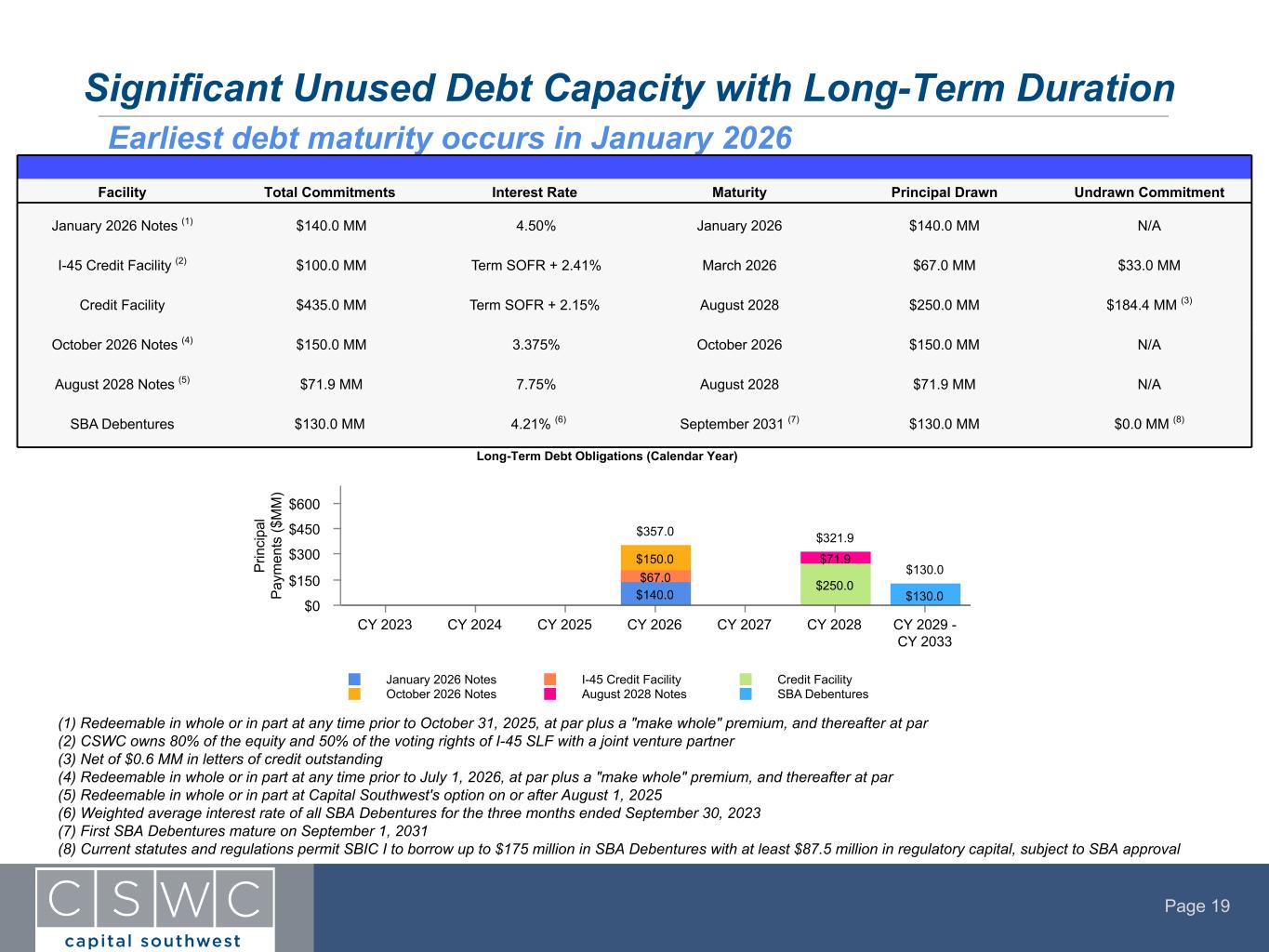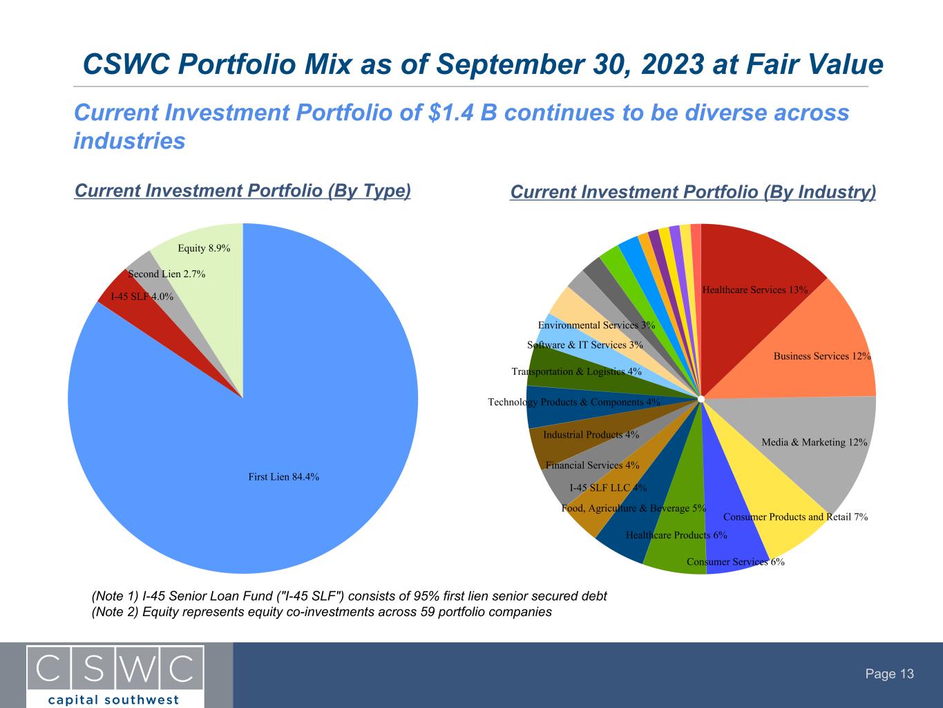 Page 12 CSWC Investment Portfolio Composition Note: All metrics above exclude the I-45 Senior Loan Fund (1) At September 30, 2023 and June 30, 2023, we had equity ownership in approximately 63% and 64%, respectively, of our investments (2) The weighted-average annual effective yields were computed using the effective interest rates during the quarter for all debt investments at cost as of September 30, 2023, including accretion of original issue discount but excluding fees payable upon repayment of the debt instruments (3) The weighted average annual effective yields on total investments were calculated by dividing total investment income, exclusive of non-recurring fees, by average total investments at fair value (4) Includes CSWC debt investments only. Weighted average EBITDA metric is calculated using investment cost basis weighting. For the quarters ended September 30, 2023 and June 30, 2023, ten portfolio companies and nine portfolio companies, respectively, are excluded from this calculation due to a reported debt to adjusted EBITDA ratio that was not meaningful (5) Includes CSWC debt investments only. Calculated as the amount of each portfolio company’s debt (including CSWC’s position and debt senior or pari passu to CSWC’s position, but excluding debt subordinated to CSWC’s position) in the capital structure divided by each portfolio company’s adjusted EBITDA. Weighted average leverage is calculated using investment cost basis weighting. For the quarters ended September 30, 2023 and June 30, 2023, ten portfolio companies and nine portfolio companies, respectively, are excluded from this calculation due to a reported debt to adjusted EBITDA ratio that was not meaningful Maintaining appropriate portfolio leverage while receiving attractive risk-adjusted returns Investment Portfolio - Statistics (in $000's) 6/30/2023 9/30/2023 Total CSWC Portfolio Total CSWC Portfolio Number of Portfolio Companies 89 94 Total Cost $1,206,225 $1,280,155 Total Fair Value $1,233,456 $1,300,144 Average Hold Size Debt Investments (at Fair Value) $13,548 $13,553 Average Hold Size Equity Investments (at Fair Value) $2,150 $2,052 % First Lien Investments (at Fair Value) 87.2% 87.8% % Second Lien Investments (at Fair Value) 2.8% 2.8% % Subordinated Debt Investments (at Fair Value) 0.1% 0.1% % Equity (at Fair Value) (1) 9.9% 9.3% Wtd. Avg. Yield on Debt Investments (2) 12.9% 13.5% Wtd. Avg. Yield on Total Investments (3) 12.6% 13.0% Wtd. Avg. EBITDA of Issuer ($MM's) (4) $20.2 $20.0 Wtd. Avg. Leverage through CSWC Security (5) 3.8x 3.6x