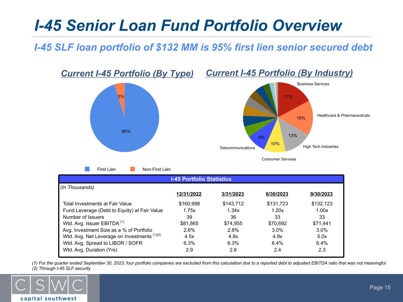 Page 14 Approximately 97% of all debt investments are currently rated a "1" or "2" as credit portfolio continues to demonstrate strong performance Investment Rating 6/30/2023 Investment Rating Upgrades Investment Rating Downgrades 9/30/2023 # of Loans Fair Value ($MM) % of Portfolio (FV) # of Loans Fair Value ($MM) % of Portfolio (FV) # of Loans Fair Value ($MM) % of Portfolio (FV) # of Loans Fair Value ($MM) % of Portfolio (FV) 1 11 $155.8 14.0% 1 $8.2 0.7% — $— —% 12 $162.9 13.8% 2 91 $912.3 82.1% 2 $21.2 1.8% — $— —% 99 $980.1 83.1% 3 5 $42.9 3.9% — $— —% 2 $16.2 1.4% 4 $29.5 2.5% 4 — $— —% — $— —% 1 $6.6 0.6% 1 $6.6 0.6% Wtd. Avg. Investment Rating (at Cost) 1.91 1.92 Quarter-over-Quarter Investment Rating Migration Note: We utilize an internally developed investment rating system to rate the performance and monitor the expected level of returns for each debt investment in our portfolio. The investment rating system takes into account both quantitative and qualitative factors of the portfolio company and the investments held therein. Investment Ratings range from a rating of 1, which represents the least amount of risk in our portfolio, to 4, which indicates that the investment is performing materially below underwriting expectations