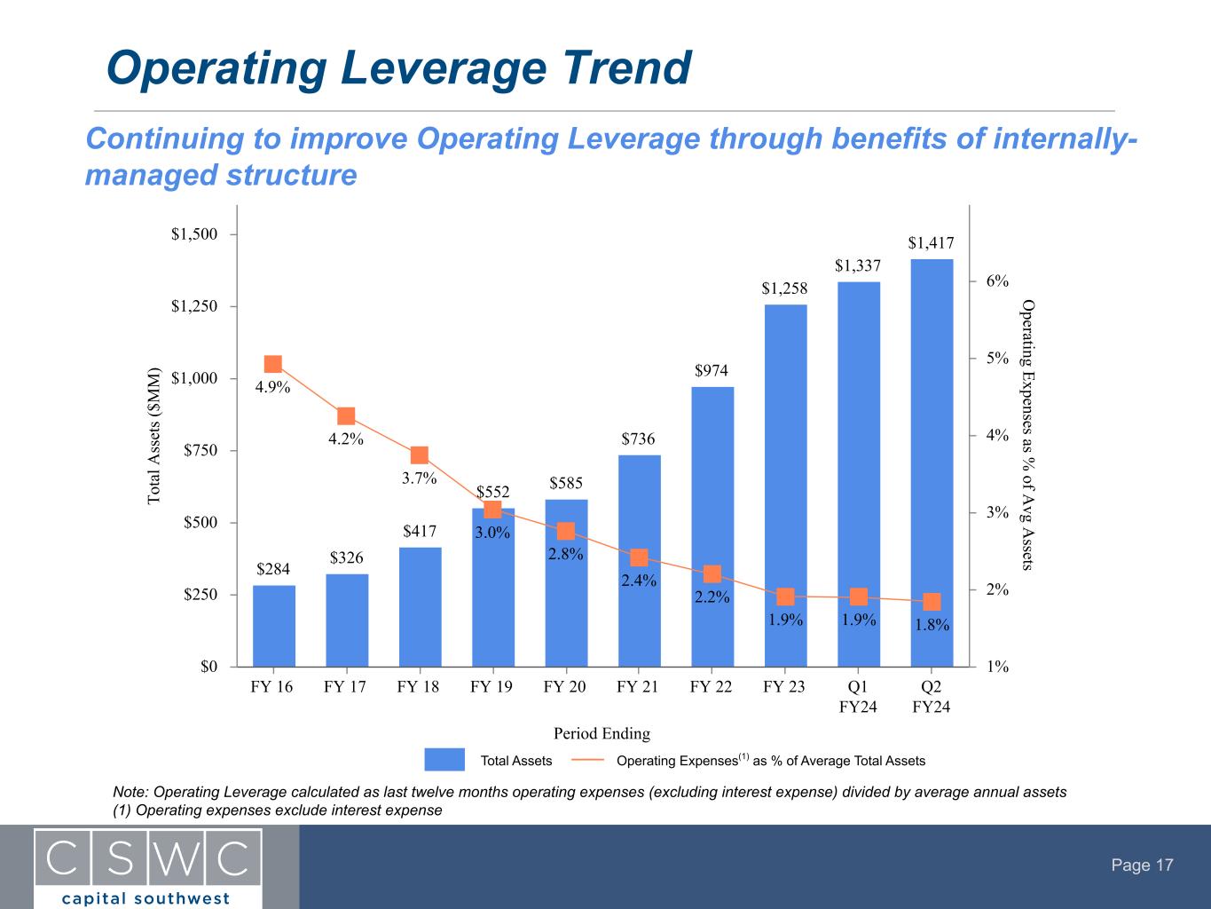 Page 17 Operating Leverage Trend Continuing to improve Operating Leverage through benefits of internally- managed structure Period Ending To ta l A ss et s ( $M M ) O perating Expenses as % of A vg A ssets$284 $326 $417 $552 $585 $736 $974 $1,258 $1,337 $1,417 4.9% 4.2% 3.7% 3.0% 2.8% 2.4% 2.2% 1.9% 1.9% 1.8% FY 16 FY 17 FY 18 FY 19 FY 20 FY 21 FY 22 FY 23 Q1 FY24 Q2 FY24 $0 $250 $500 $750 $1,000 $1,250 $1,500 1% 2% 3% 4% 5% 6% Total Assets Operating Expenses(1) as % of Average Total Assets Note: Operating Leverage calculated as last twelve months operating expenses (excluding interest expense) divided by average annual assets (1) Operating expenses exclude interest expense