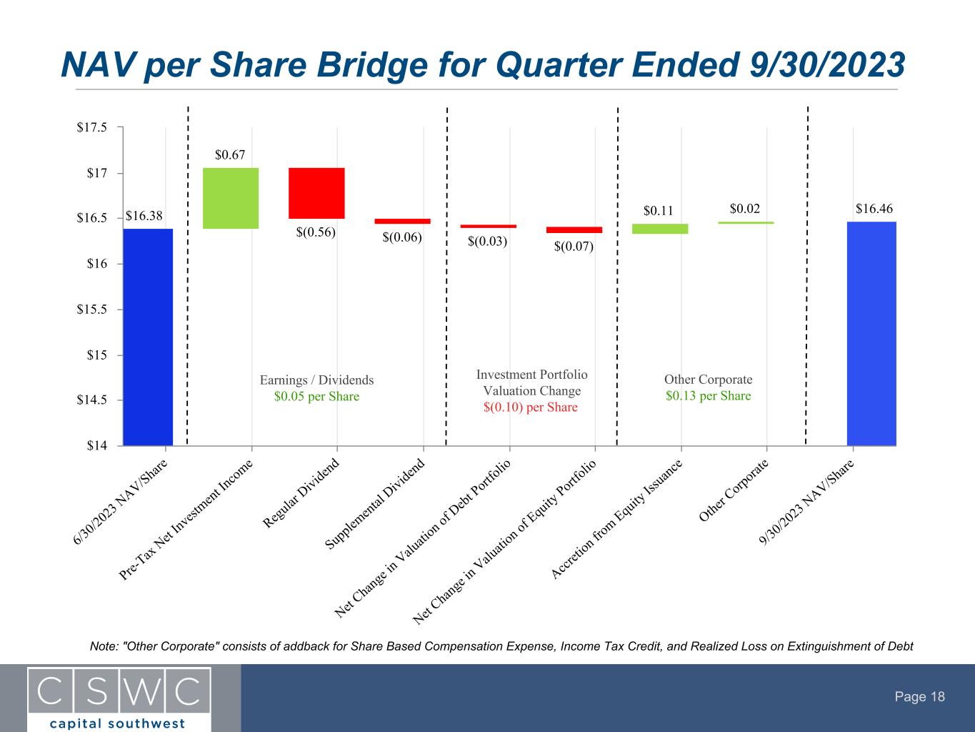 Page 18 $16.38 $0.67 $(0.56) $(0.06) $(0.03) $(0.07) $0.11 $0.02 $16.46 6/3 0/2 02 3 N AV/Shar e Pre- Tax Net I nv est ment In com e Regu lar Divi den d Sup ple ment al D ivi den d Net C han ge in Valu ati on of Debt Port fol io Net C han ge in Valu ati on of Equ ity Port fol io Accr eti on fro m Equ ity Iss uan ce Othe r C orp ora te 9/3 0/2 02 3 N AV/Shar e $14 $14.5 $15 $15.5 $16 $16.5 $17 $17.5 NAV per Share Bridge for Quarter Ended 9/30/2023 Earnings / Dividends $0.05 per Share Investment Portfolio Valuation Change $(0.10) per Share Other Corporate $0.13 per Share Note: "Other Corporate" consists of addback for Share Based Compensation Expense, Income Tax Credit, and Realized Loss on Extinguishment of Debt